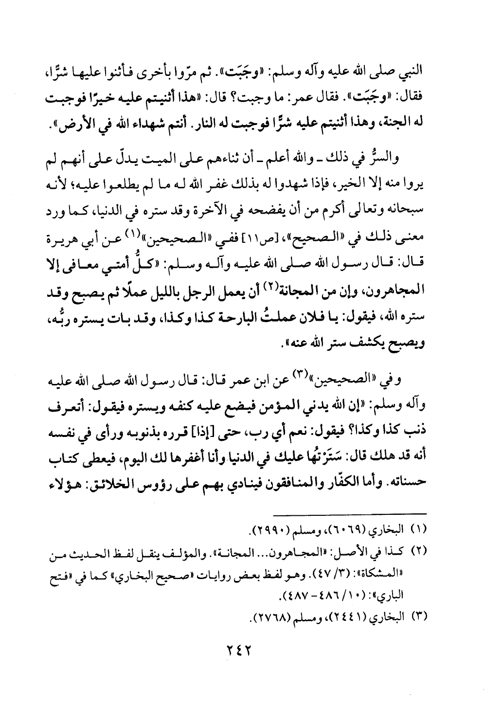 والسرُّ في ذلك ــ والله أعلم ــ أن ثناءهم على الميت يدلّ على أنهم لم يروا منه إلا الخير، فإذا شهدوا له بذلك غفر الله له ما لم يطلعوا عليه؛ لأنه سبحانه وتعالى أكرم من أن يفضحه في الآخرة وقد ستره في الدنيا، كما ورد معنى ذلك في «الصحيح»، [ص ١١] ففي «الصحيحين» (¬١) عن أبي هريرة قال: قال رسول الله صلى الله عليه وآله وسلم: «كلُّ أمتي معافى إلا المجاهرون، وإن من المجانة (¬٢) أن يعمل الرجل بالليل عملًا ثم يصبح وقد ستره الله، فيقول: يا فلان عملتُ البارحة كذا وكذا، وقد بات يستره ربُّه، ويصبح يكشف ستر الله عنه».