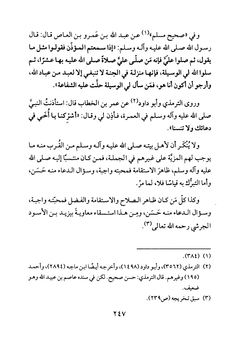 ولا يُنْكَر أن لأهل بيته صلى الله عليه وآله وسلم من القُرب منه ما يوجب لهم المزيَّة على غيرهم في الجملة، فمن كان منتسبًا إليه صلى الله عليه وآله وسلم، ظاهرَ الاستقامة فمحبته واجبة، وسؤال الدعاء منه حَسَن، وأما التبرُّك به قياسًا فلا، لما مرّ.