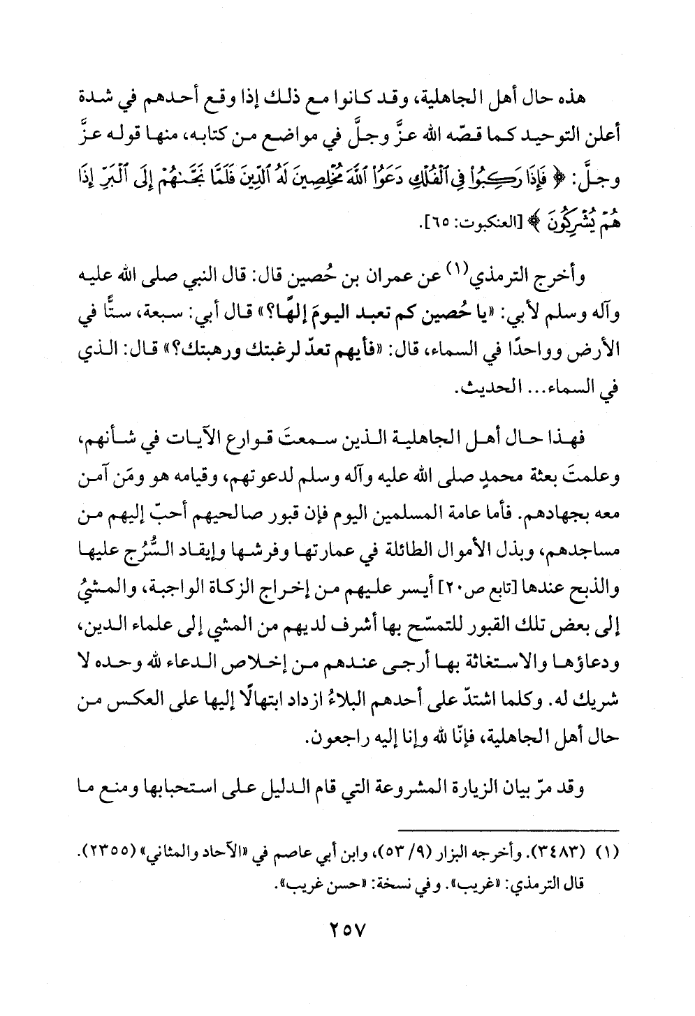 فهذا حال أهل الجاهلية الذين سمعتَ قوارع الآيات في شأنهم، وعلمتَ بعثة محمدٍ صلى الله عليه وآله وسلم لدعوتهم، وقيامه هو ومَن آمن معه بجهادهم. فأما عامة المسلمين اليوم فإن قبور صالحيهم أحبّ إليهم من مساجدهم، وبذل الأموال الطائلة في عمارتها وفرشها وإيقاد السُّرُج عليها والذبح عندها [تابع ص ٢٠] أيسر عليهم من إخراج الزكاة الواجبة، والمشيُ إلى بعض تلك القبور للتمسّح بها أشرف لديهم من المشي إلى علماء الدين، ودعاؤها والاستغاثة بها أرجى عندهم من إخلاص الدعاء لله وحده لا شريك له. وكلما اشتدّ على أحدهم البلاءُ ازداد ابتهالًا إليها على العكس من حال أهل الجاهلية، فإنّا لله وإنا إليه راجعون.