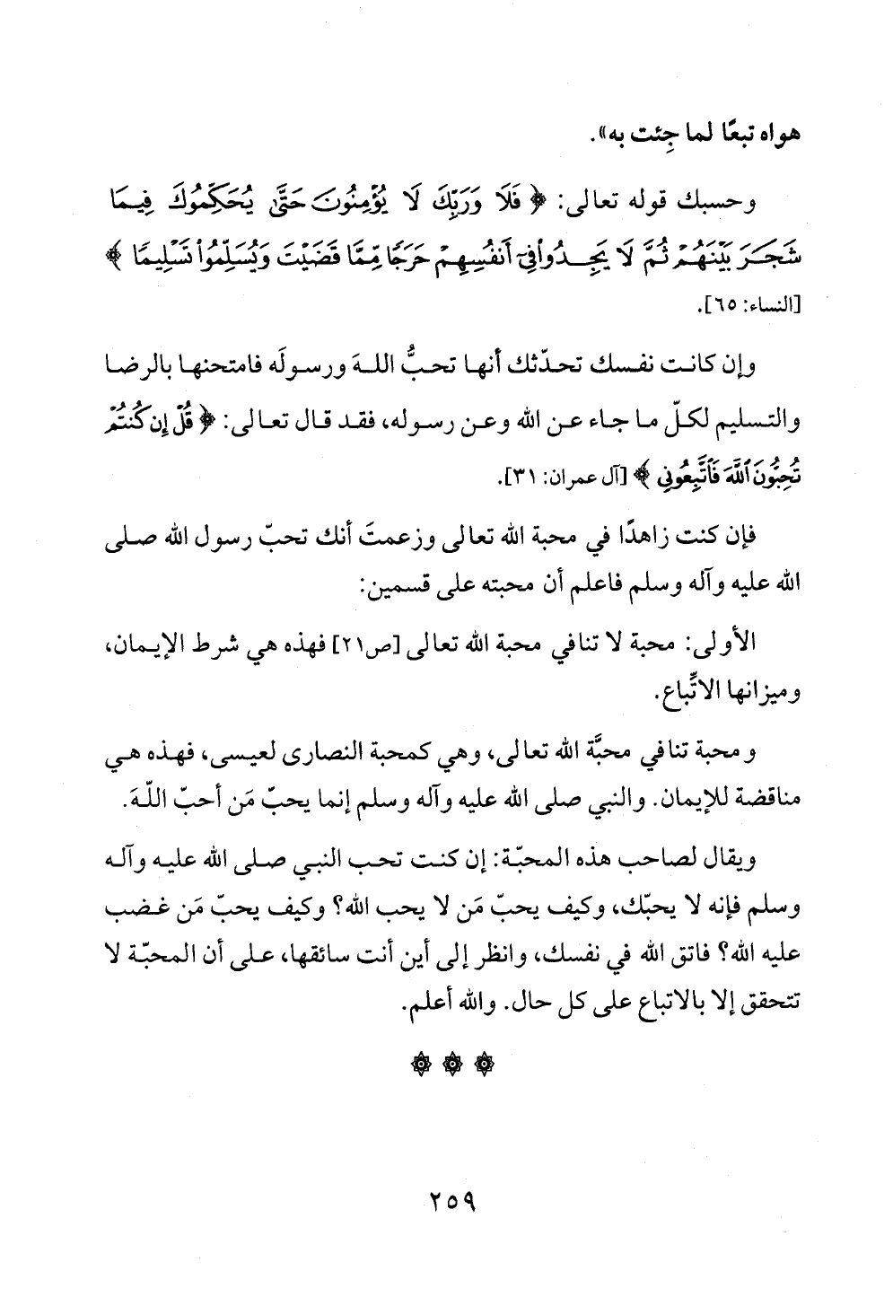 الأولى: محبة لا تنافي محبة الله تعالى [ص ٢١] فهذه هي شرط الإيمان، وميزانها الاتِّباع.