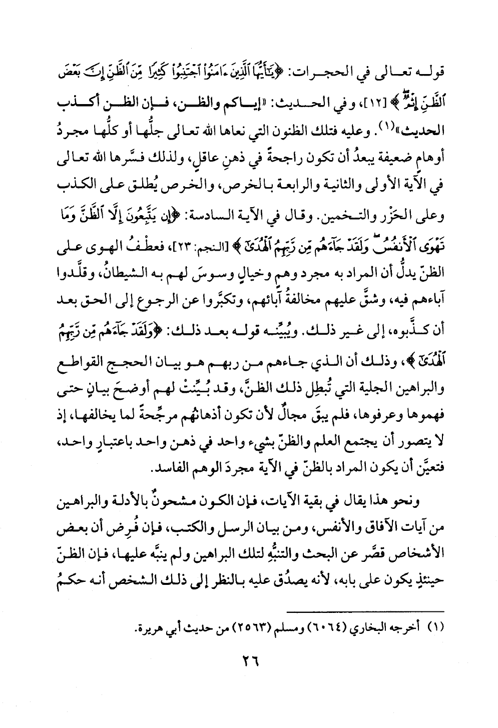 قوله تعالى في الحجرات: {يَاأَيُّهَا الَّذِينَ آمَنُوا اجْتَنِبُوا كَثِيرًا مِنَ الظَّنِّ إِنَّ بَعْضَ الظَّنِّ إِثْمٌ} [١٢]، وفي الحديث: "إياكم والظن، فإن الظن أكذب الحديث" (¬١). وعليه فتلك الظنون التي نعاها الله تعالى جلُّها أو كلُّها مجردُ أوهامٍ ضعيفة يبعدُ أن تكون راجحةً في ذهنِ عاقلٍ، ولذلك فسَّرها الله تعالى في الآية الأولى والثانية والرابعة بالخرص، والخرص يُطلق على الكذب وعلى الحَزْر والتخمين. وقال في الآية السادسة: {إِنْ يَتَّبِعُونَ إِلَّا الظَّنَّ وَمَا تَهْوَى الْأَنْفُسُ وَلَقَدْ جَاءَهُمْ مِنْ رَبِّهِمُ الْهُدَى} [النجم: ٢٣]، فعطْفُ الهوى على الظنّ يدلُّ أن المراد به مجرد وهمٍ وخيالٍ وسوسَ لهم به الشيطانُ، وقلَّدوا آباءهم فيه، وشقَّ عليهم مخالفةُ آبائهم، وتكبَّروا عن الرجوع إلى الحق بعد أن كذَّبوه، إلى غير ذلك. ويُبيِّنه قوله بعد ذلك: {وَلَقَدْ جَاءَهُمْ مِنْ رَبِّهِمُ الْهُدَى}، وذلك أن الذي جاءهم من ربهم هو بيان الحجج القواطع والبراهين الجلية التي تُبطِل ذلك الظنَّ، وقد بُيِّنتْ لهم أوضحَ بيانٍ حتى فهموها وعرفوها، فلم يبقَ مجالٌ لأن تكون أذهانُهم مرجِّحةً لما يخالفها، إذ لا يتصور أن يجتمع العلم والظنّ بشيء واحد في ذهن واحد باعتبارٍ واحد، فتعيَّن أن يكون المراد بالظنّ في الآية مجردَ الوهم الفاسد.