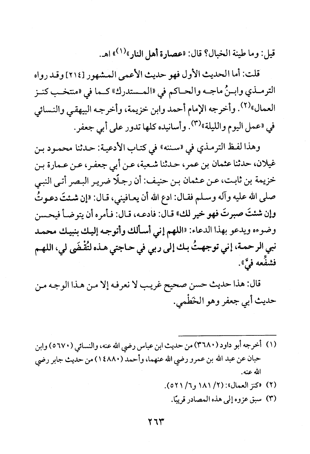 وهذا لفظ الترمذي في «سننه» في كتاب الأدعية: حدثنا محمود بن غيلان، حدثنا عثمان بن عمر، حدثنا شعبة، عن أبي جعفر، عن عمارة بن خزيمة بن ثابت، عن عثمان بن حنيف: أن رجلًا ضرير البصر أتى النبي صلى الله عليه وآله وسلم فقال: ادع الله أن يعافيني، قال: «إن شئتَ دعوتُ وإن شئتَ صبرتَ فهو خير لك» قال: فادعه، قال: فأمره أن يتوضأ فيحسن وضوءه ويدعو بهذا الدعاء: «اللهم إني أسألك وأتوجه إليك بنبيك محمد نبي الرحمة، إني توجهتُ بك إلى ربي في حاجتي هذه لتُقْضَى لي، اللهم فشفِّعه فيَّ».