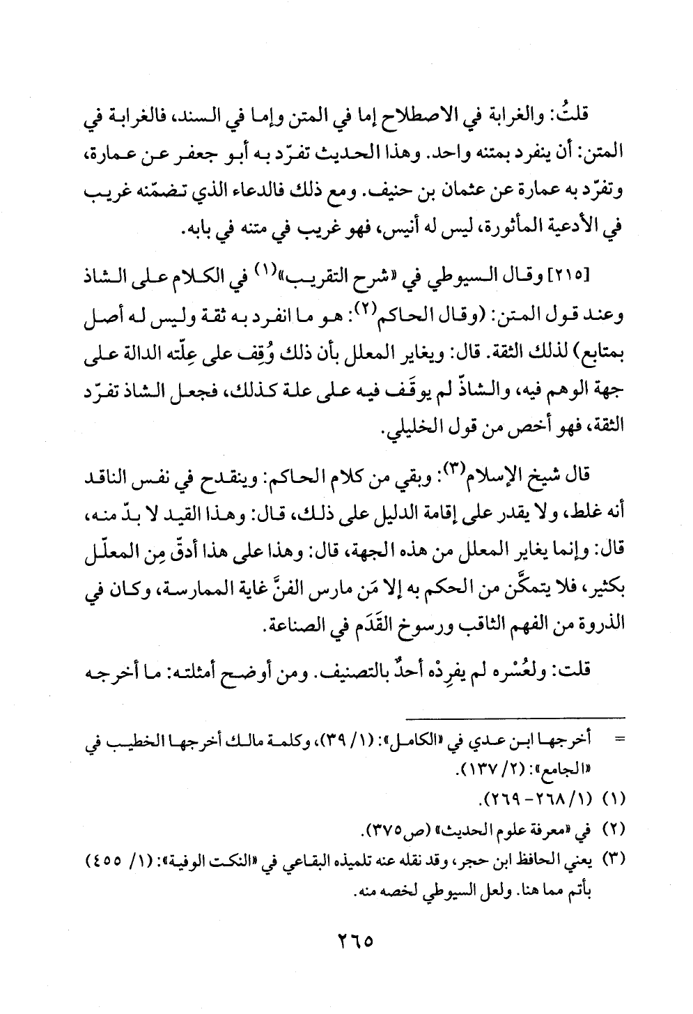 [٢١٥] وقال السيوطي في «شرح التقريب» (¬١) في الكلام على الشاذ وعند قول المتن: (وقال الحاكم (¬٢): هو ما انفرد به ثقة وليس له أصل بمتابع) لذلك الثقة. قال: ويغاير المعلل بأن ذلك وُقِف على عِلّته الدالة على جهة الوهم فيه، والشاذّ لم يوقَف فيه على علة كذلك، فجعل الشاذ تفرّد الثقة، فهو أخص من قول الخليلي.