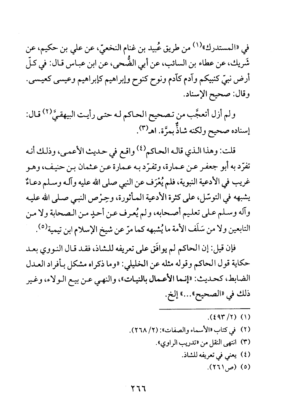 قلت: وهذا الذي قاله الحاكم (¬٤) واقع في حديث الأعمى، وذلك أنه تفرّد به أبو جعفر عن عمارة، وتفرّد به عمارة عن عثمان بن حنيف، وهو غريب في الأدعية النبوية، فلم يُعْرَف عن النبي صلى الله عليه وآله وسلم دعاءٌ يشبهه في التوسّل، على كثرة الأدعية المأثورة، وحِرْص النبي صلى الله عليه وآله وسلم على تعليم أصحابه، ولم يُعرف عن أحدٍ من الصحابة ولا من التابعين ولا من سَلَف الأمة ما يُشبهه كما مرّ عن شيخ الإسلام ابن تيمية (¬٥).