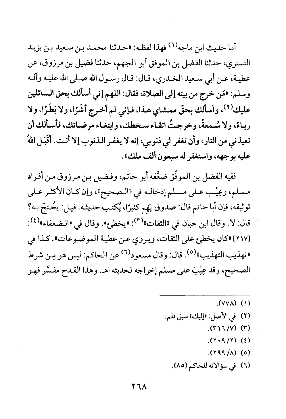أما حديث ابن ماجه (¬١) فهذا لفظه: «حدثنا محمد بن سعيد بن يزيد التستري، حدثنا الفضل بن الموفق أبو الجهم، حدثنا فضيل بن مرزوق، عن عطية، عن أبي سعيد الخدري، قال: قال رسول الله صلى الله عليه وآله وسلم: «مَن خرج من بيته إلى الصلاة، فقال: اللهم إني أسألك بحق السائلين عليك (¬٢)، وأسألك بحقّ ممشاي هذا، فإني لم أخرج أشَرًا، ولا بَطَرًا، ولا رياءً، ولا سُمعةً، وخرجتُ اتقاء سخطك، وابتغاء مرضاتك، فأسألك أن تعيذني من النار، وأن تغفر لي ذنوبي، إنه لا يغفر الذنوب إلا أنت. أقَبَل اللهُ عليه بوجهه، واستغفر له سبعون ألف ملك».