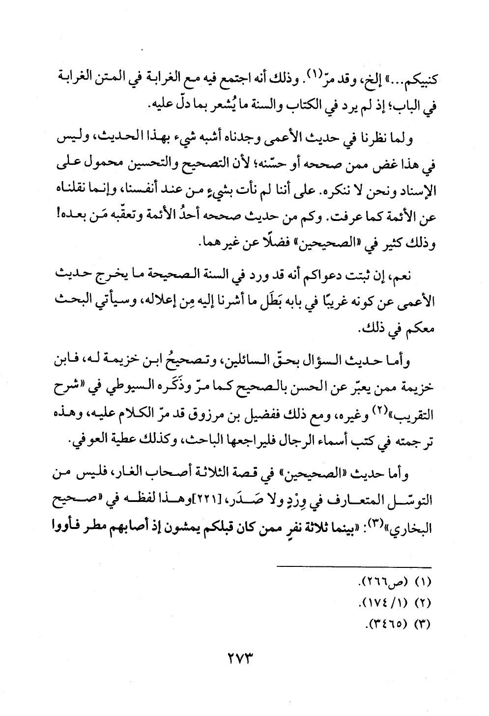 ولما نظرنا في حديث الأعمى وجدناه أشبه شيء بهذا الحديث، وليس في هذا غض ممن صححه أو حسّنه؛ لأن التصحيح والتحسين محمول على الإسناد ونحن لا ننكره. على أننا لم نأت بشيءٍ من عند أنفسنا، وإنما نقلناه عن الأئمة كما عرفت. وكم من حديث صححه أحدُ الأئمة وتعقّبه مَن بعده! وذلك كثير في «الصحيحين» فضلًا عن غيرهما.