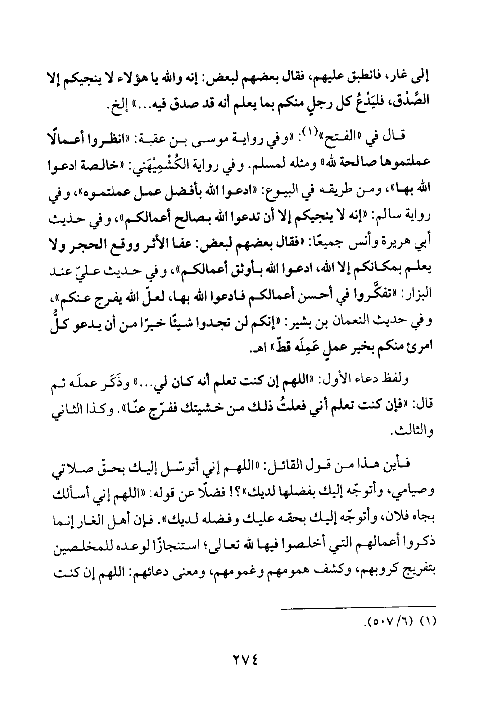فأين هذا من قول القائل: «اللهم إني أتوسّل إليك بحقّ صلاتي وصيامي، وأتوجّه إليك بفضلها لديك»؟ ! فضلًا عن قوله: «اللهم إني أسألك بجاه فلان، وأتوجّه إليك بحقه عليك وفضله لديك». فإن أهل الغار إنما ذكروا أعمالهم التي أخلصوا فيها لله تعالى؛ استنجازًا لوعده للمخلصين بتفريج كروبهم، وكشف همومهم وغمومهم، ومعنى دعائهم: اللهم إن كنت