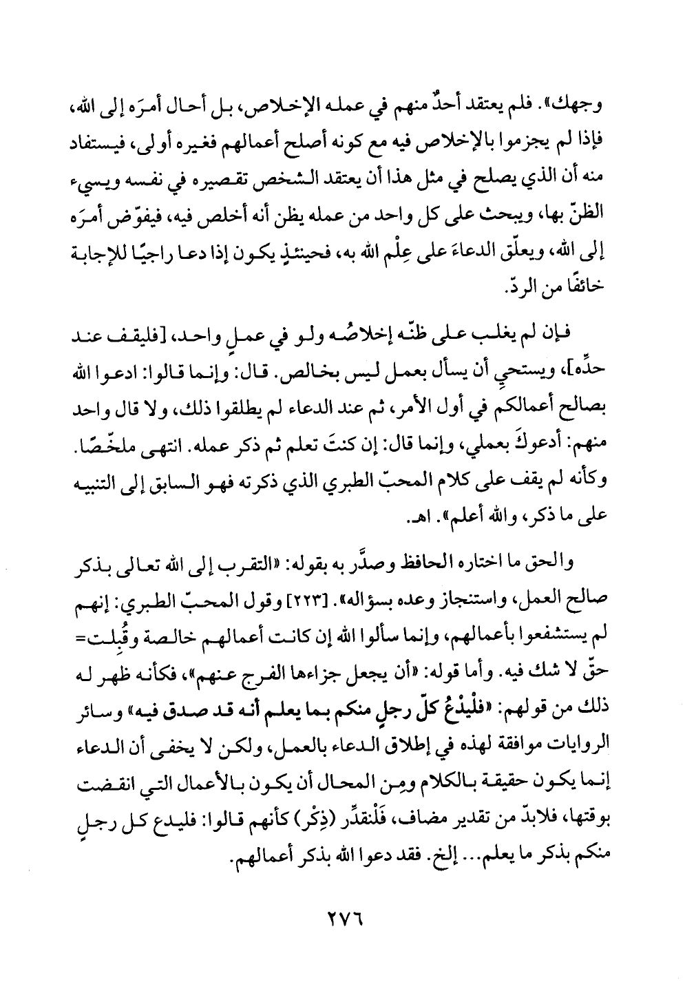 فإن لم يغلب على ظنّه إخلاصُه ولو في عملٍ واحد، [فليقف عند حدِّه]، ويستحيِ أن يسأل بعمل ليس بخالص. قال: وإنما قالوا: ادعوا الله بصالح أعمالكم في أول الأمر، ثم عند الدعاء لم يطلقوا ذلك، ولا قال واحد منهم: أدعوكَ بعملي، وإنما قال: إن كنتَ تعلم ثم ذكر عمله. انتهى ملخّصًا. وكأنه لم يقف على كلام المحبّ الطبري الذي ذكرته فهو السابق إلى التنبيه على ما ذكر، والله أعلم». اهـ.