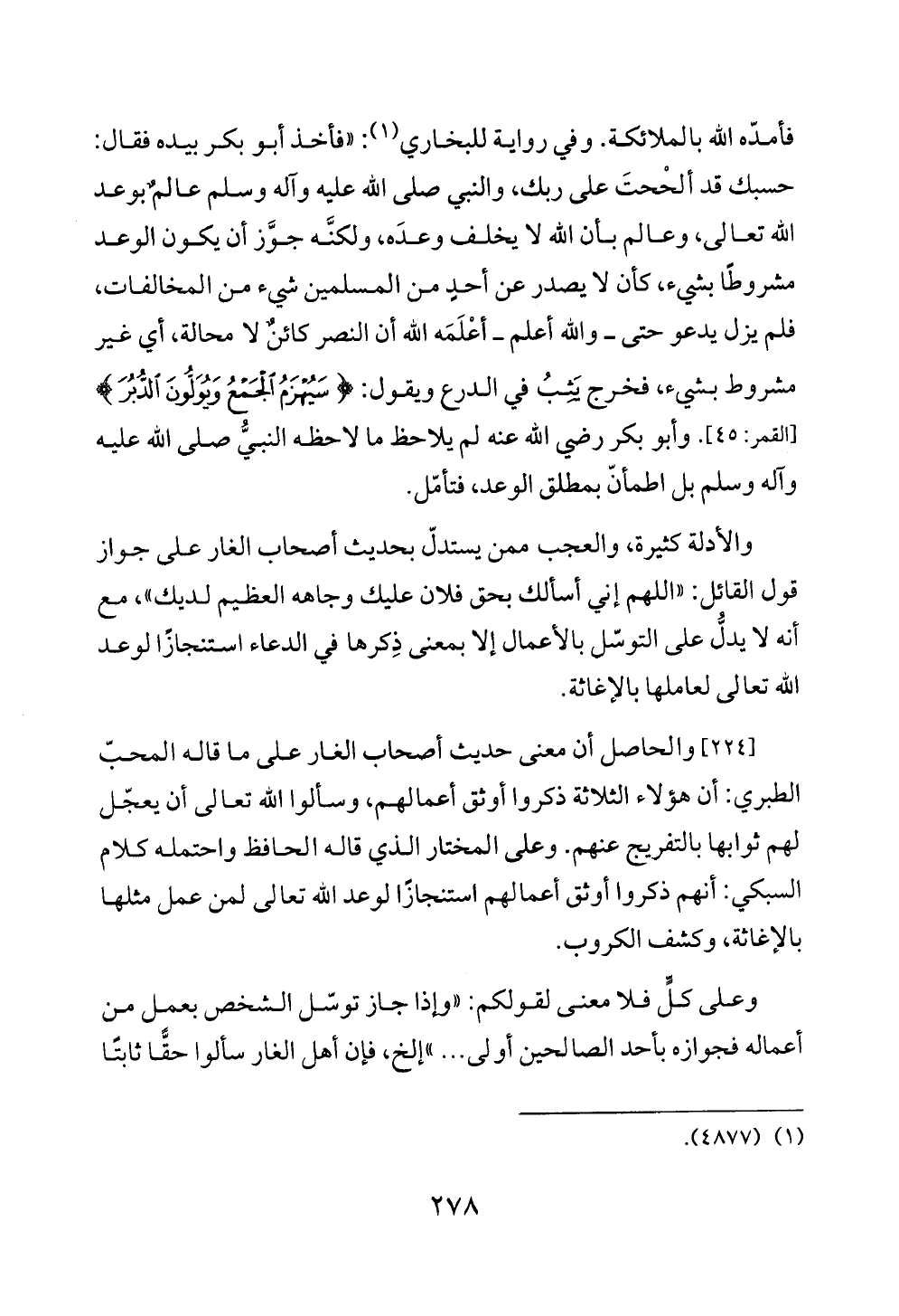 [٢٢٤] والحاصل أن معنى حديث أصحاب الغار على ما قاله المحبّ الطبري: أن هؤلاء الثلاثة ذكروا أوثق أعمالهم، وسألوا الله تعالى أن يعجّل لهم ثوابها بالتفريج عنهم. وعلى المختار الذي قاله الحافظ واحتمله كلام السبكي: أنهم ذكروا أوثق أعمالهم استنجازًا لوعد الله تعالى لمن عمل مثلها بالإغاثة، وكشف الكروب.