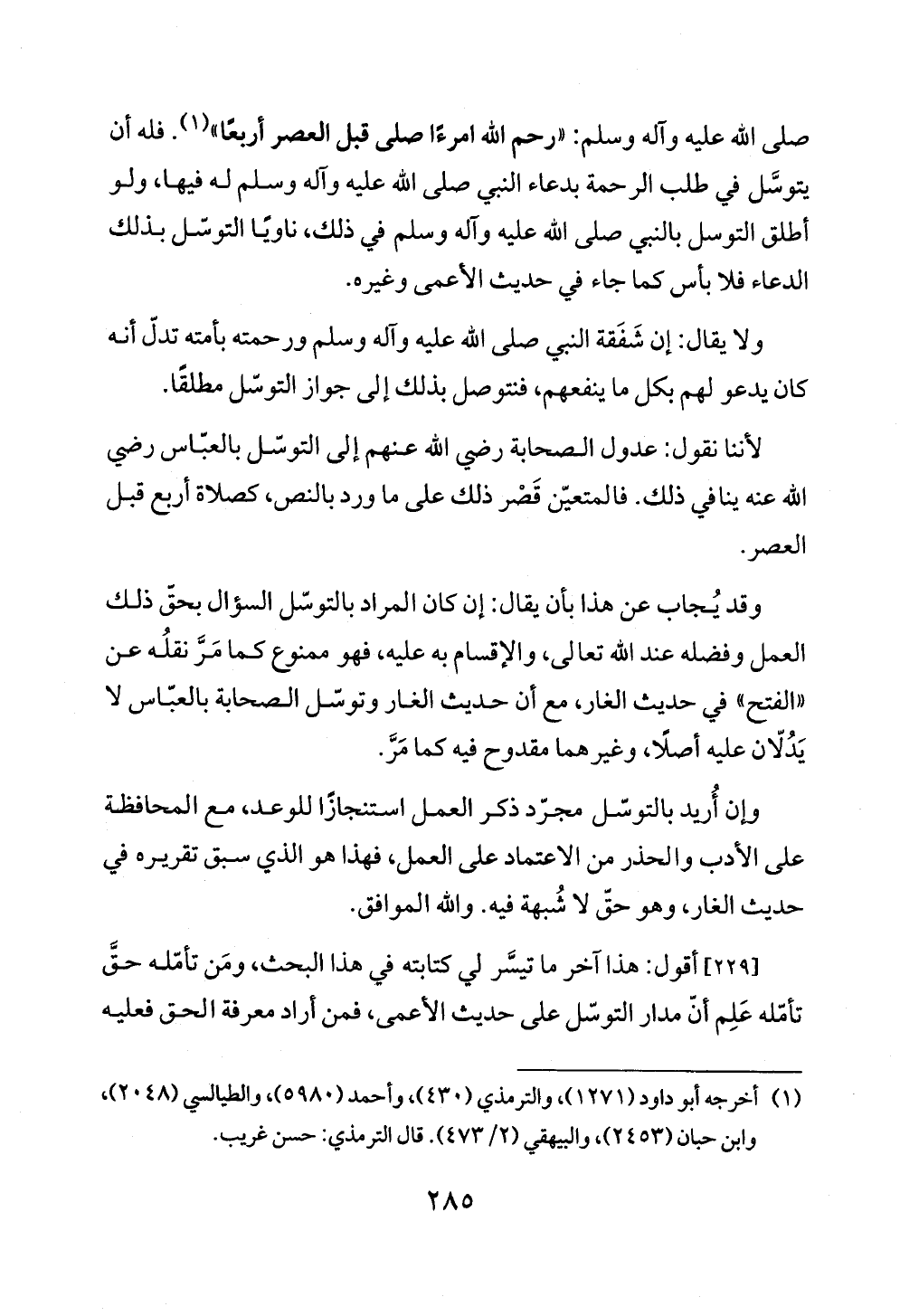 [٢٢٩] أقول: هذا آخر ما تيسَّر لي كتابته في هذا البحث، ومَن تأمّله حقَّ تأمّله عَلِم أنّ مدار التوسّل على حديث الأعمى، فمن أراد معرفة الحق فعليه