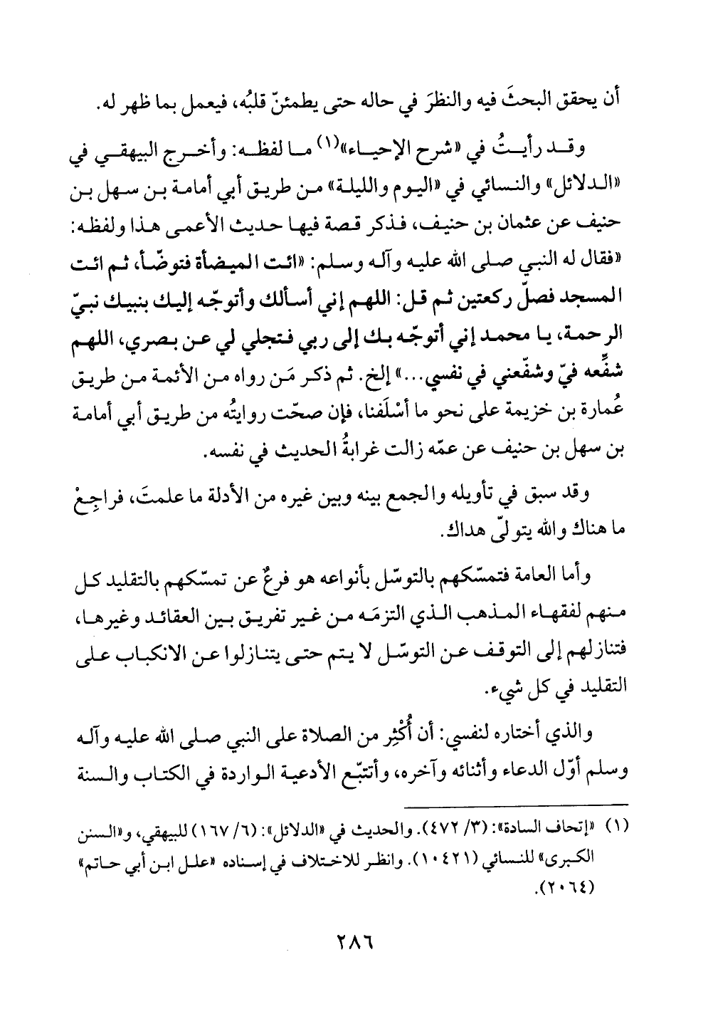 وقد رأيتُ في «شرح الإحياء» (¬١) ما لفظه: وأخرج البيهقي في «الدلائل» والنسائي في «اليوم والليلة» من طريق أبي أمامة بن سهل بن حنيف عن عثمان بن حنيف، فذكر قصة فيها حديث الأعمى هذا ولفظه: «فقال له النبي صلى الله عليه وآله وسلم: «ائت الميضأة فتوضّأ، ثم ائت المسجد فصلّ ركعتين ثم قل: اللهم إني أسألك وأتوجّه إليك بنبيك نبيّ الرحمة، يا محمد إني أتوجّه بك إلى ربي فتجلي لي عن بصري، اللهم شفِّعه فيّ وشفّعني في نفسي ... » إلخ. ثم ذكر مَن رواه من الأئمة من طريق عُمارة بن خزيمة على نحو ما أسْلَفنا، فإن صحّت روايتُه من طريق أبي أمامة بن سهل بن حنيف عن عمّه زالت غرابةُ الحديث في نفسه.
