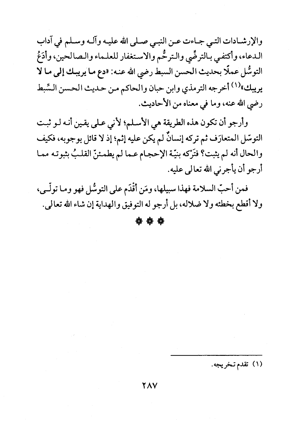 والإرشادات التي جاءت عن النبي صلى الله عليه وآله وسلم في آداب الدعاء، وأكتفي بالترضِّي والترحُّم والاستغفار للعلماء والصالحين، وأدَعُ التوسُّل عملًا بحديث الحسن السبط رضي الله عنه: «دع ما يريبك إلى ما لا يريبك» (¬١) أخرجه الترمذي وابن حبان والحاكم من حديث الحسن السِّبط رضي الله عنه، وما في معناه من الأحاديث.