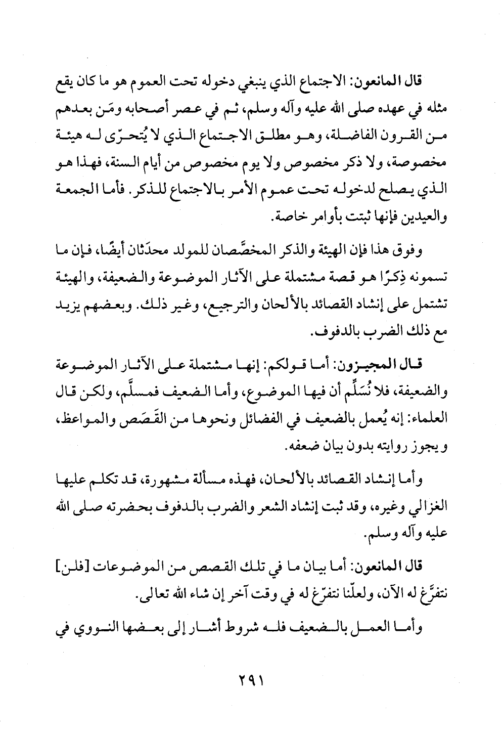 قال المانعون: الاجتماع الذي ينبغي دخوله تحت العموم هو ما كان يقع مثله في عهده صلى الله عليه وآله وسلم، ثم في عصر أصحابه ومَن بعدهم من القرون الفاضلة، وهو مطلق الاجتماع الذي لا يُتحرّى له هيئة مخصوصة، ولا ذكر مخصوص ولا يوم مخصوص من أيام السنة، فهذا هو الذي يصلح لدخوله تحت عموم الأمر بالاجتماع للذكر. فأما الجمعة والعيدين فإنها ثبتت بأوامر خاصة.