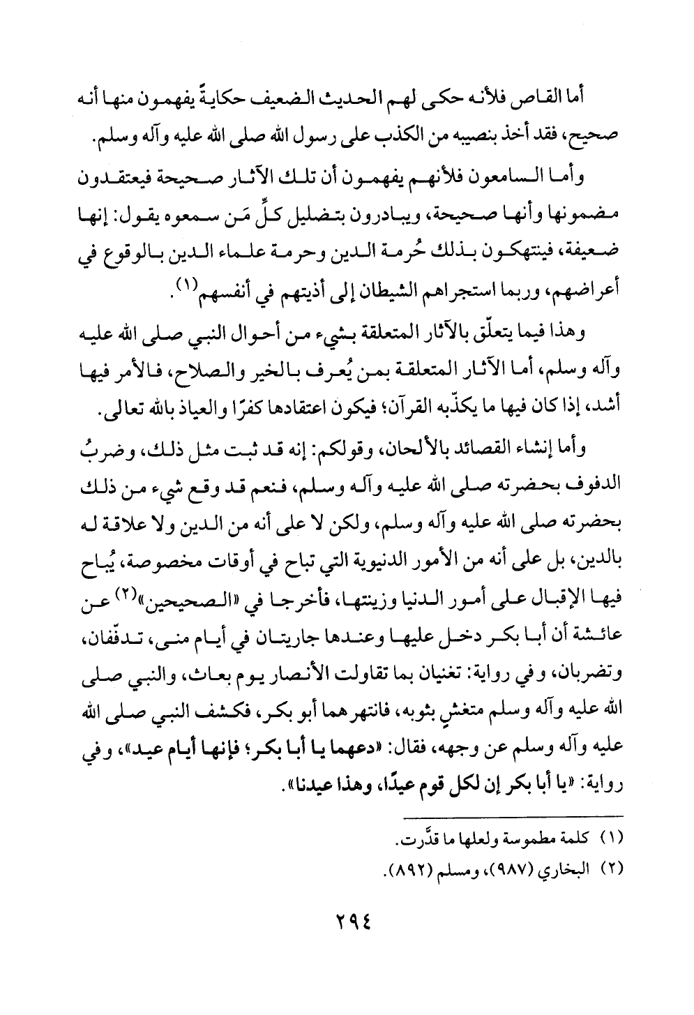 وأما إنشاء القصائد بالألحان، وقولكم: إنه قد ثبت مثل ذلك، وضربُ الدفوف بحضرته صلى الله عليه وآله وسلم، فنعم قد وقع شيء من ذلك بحضرته صلى الله عليه وآله وسلم، ولكن لا على أنه من الدين ولا علاقة له بالدين، بل على أنه من الأمور الدنيوية التي تباح في أوقات مخصوصة، يُباح فيها الإقبال على أمور الدنيا وزينتها، فأخرجا في «الصحيحين» (¬٢) عن عائشة أن أبا بكر دخل عليها وعندها جاريتان في أيام منى، تدفّفان، وتضربان، وفي رواية: تغنيان بما تقاولت الأنصار يوم بعاث، والنبي صلى الله عليه وآله وسلم متغشٍ بثوبه، فانتهرهما أبو بكر، فكشف النبي صلى الله عليه وآله وسلم عن وجهه، فقال: «دعهما يا أبا بكر؛ فإنها أيام عيد»، وفي رواية: «يا أبا بكر إن لكل قوم عيدًا، وهذا عيدنا».