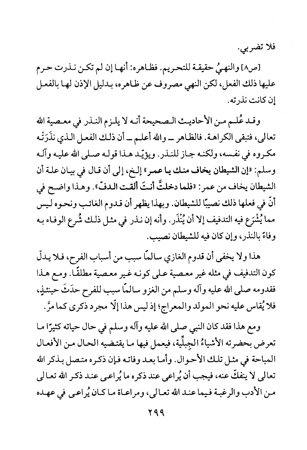 وقد عُلم من الأحاديث الصحيحة أنه لا يلزم النذر في معصية الله تعالى، فتبقى الكراهة. فالظاهر ــ والله أعلم ــ أن ذلك الفعل الذي نذَرَتْه مكروه في نفسه، ولكنه جاز للنذر. ويؤيّد هذا قوله صلى الله عليه وآله وسلم: «إن الشيطان يخاف منك يا عمر» إلخ، إلى أن قال في بيان علة أن الشيطان يخاف من عمر: «فلما دخلتَّ أنتَ ألقت الدفّ». وهذا واضح في أنّ في فعلها ذلك نصيبًا للشيطان. وبهذا يظهر أن قدوم الغائب ونحوه ليس مما يُشْرَع فيه التدفيف إلا أن يُنْذَر. وأنه إن نذر في مثل ذلك شُرع الوفاء به وفاءً بالنذر، وإن كان فيه للشيطان نصيب.