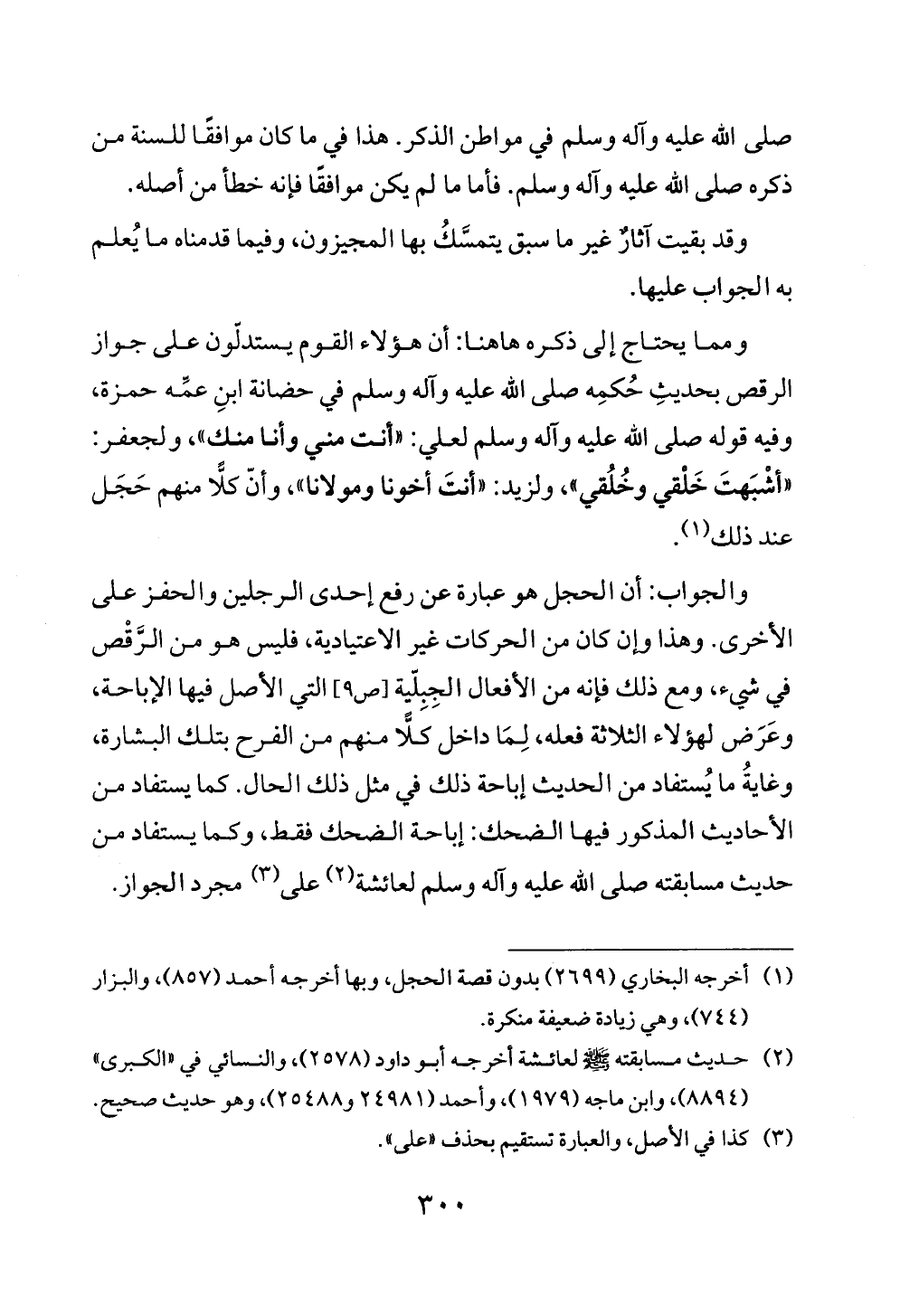 والجواب: أن الحجل هو عبارة عن رفع إحدى الرجلين والحفز على الأخرى. وهذا وإن كان من الحركات غير الاعتيادية، فليس هو من الرَّقْص في شيء، ومع ذلك فإنه من الأفعال الجِبِلّية [ص ٩] التي الأصل فيها الإباحة، وعَرَض لهؤلاء الثلاثة فعله، لِمَا داخل كلًّا منهم من الفرح بتلك البشارة، وغايةُ ما يُستفاد من الحديث إباحة ذلك في مثل ذلك الحال. كما يستفاد من الأحاديث المذكور فيها الضحك: إباحة الضحك فقط، وكما يستفاد من حديث مسابقته صلى الله عليه وآله وسلم لعائشة (¬٢) على (¬٣) مجرد الجواز.