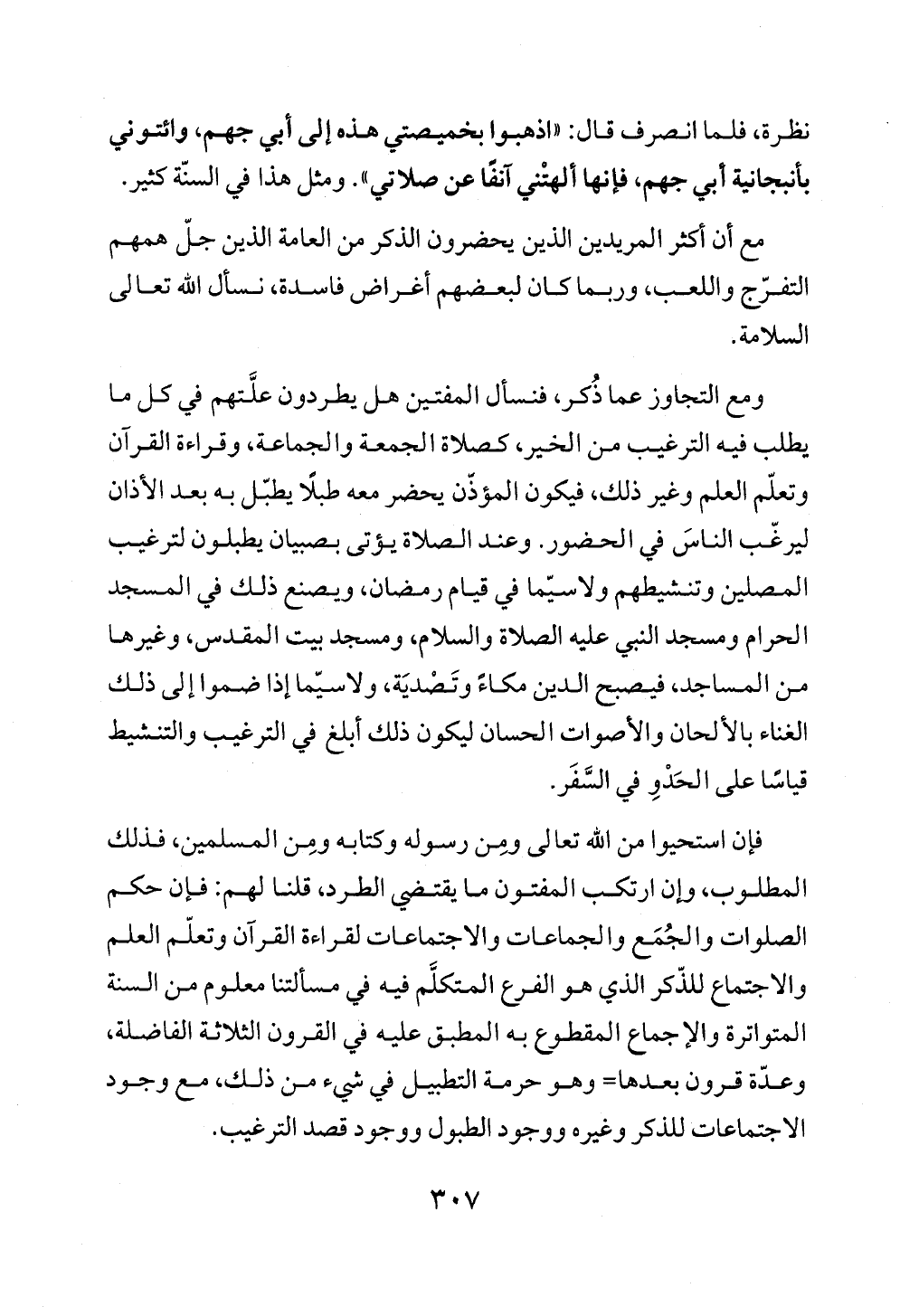 فإن استحيوا من الله تعالى ومِن رسوله وكتابه ومِن المسلمين، فذلك المطلوب، وإن ارتكب المفتون ما يقتضي الطرد، قلنا لهم: فإن حكم الصلوات والجُمَع والجماعات والاجتماعات لقراءة القرآن وتعلّم العلم والاجتماع للذّكر الذي هو الفرع المتكلَّم فيه في مسألتنا معلوم من السنة المتواترة والإجماع المقطوع به المطبق عليه في القرون الثلاثة الفاضلة، وعدّة قرون بعدها= وهو حرمة التطبيل في شيء من ذلك، مع وجود الاجتماعات للذكر وغيره ووجود الطبول ووجود قصد الترغيب.