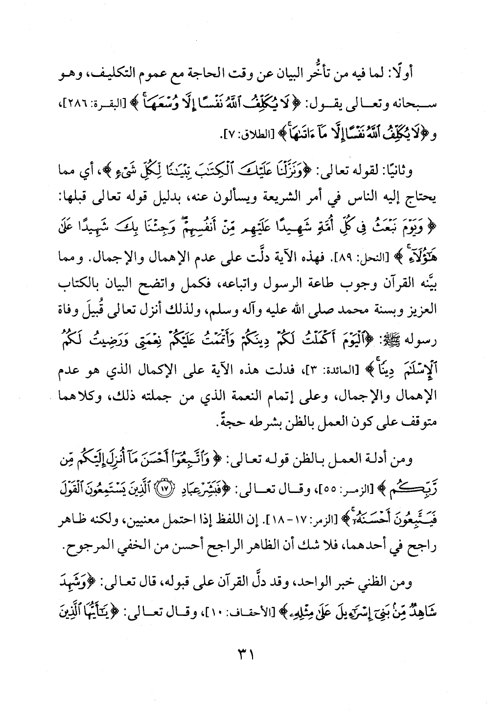 وثانيًا: لقوله تعالى: {وَنَزَّلْنَا عَلَيْكَ الْكِتَابَ تِبْيَانًا لِكُلِّ شَيْءٍ}، أي مما يحتاج إليه الناس في أمر الشريعة ويسألون عنه، بدليل قوله تعالى قبلها: {وَيَوْمَ نَبْعَثُ فِي كُلِّ أُمَّةٍ شَهِيدًا عَلَيْهِمْ مِنْ أَنْفُسِهِمْ وَجِئْنَا بِكَ شَهِيدًا عَلَى هَؤُلَاءِ} [النحل: ٨٩]. فهذه الآية دلَّت على عدم الإهمال والإجمال. ومما بيَّنه القرآن وجوب طاعة الرسول واتباعه، فكمل واتضح البيان بالكتاب العزيز وبسنة محمد صلى الله عليه وآله وسلم، ولذلك أنزل تعالى قُبيلَ وفاة رسوله - صلى الله عليه وسلم -: {الْيَوْمَ أَكْمَلْتُ لَكُمْ دِينَكُمْ وَأَتْمَمْتُ عَلَيْكُمْ نِعْمَتِي وَرَضِيتُ لَكُمُ الْإِسْلَامَ دِينًا} [المائدة: ٣]، فدلت هذه الآية على الإكمال الذي هو عدم الإهمال والإجمال، وعلى إتمام النعمة الذي من جملته ذلك، وكلاهما متوقف على كون العمل بالظن بشرطه حجةً.