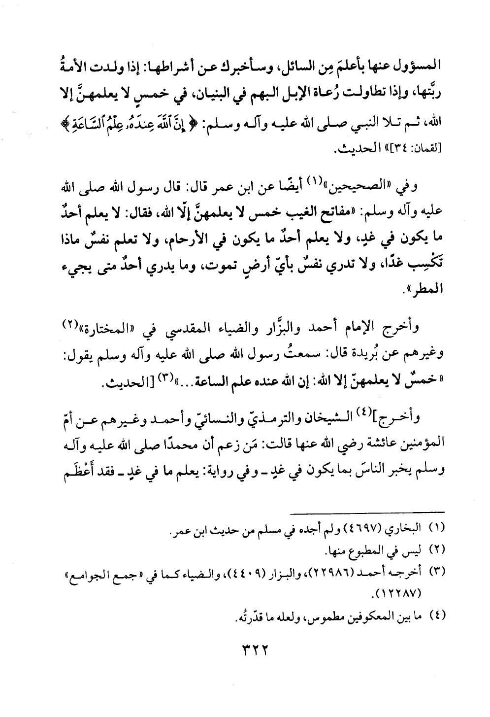 وأخرج الإمام أحمد والبزَّار والضياء المقدسي في «المختارة» (¬٢) وغيرهم عن بُريدة قال: سمعتُ رسول الله صلى الله عليه وآله وسلم يقول: «خمسٌ لا يعلمهنّ إلا الله: إن الله عنده علم الساعة ... » (¬٣) [الحديث.