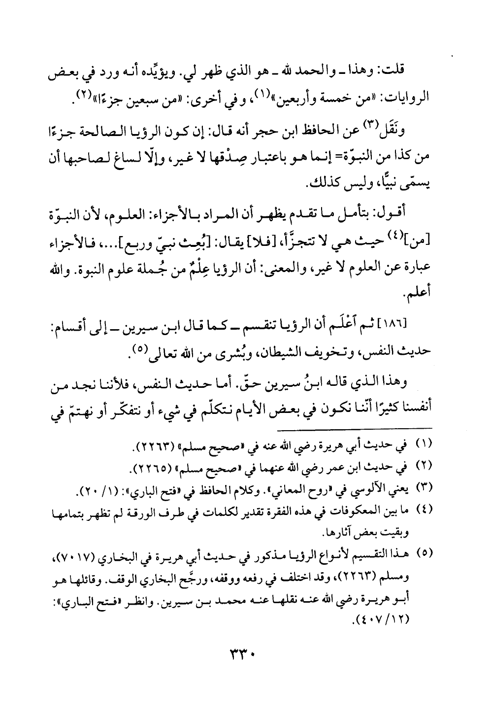 (¬٥) هذا التقسيم لأنواع الرؤيا مذكور في حديث أبي هريرة في البخاري (٧٠١٧)، ومسلم (٢٢٦٣)، وقد اختلف في رفعه ووقفه، ورجَّح البخاري الوقف. وقائلها هو أبو هريرة رضي الله عنه نقلها عنه محمد بن سيرين. وانظر «فتح الباري»: (١٢/ ٤٠٧).