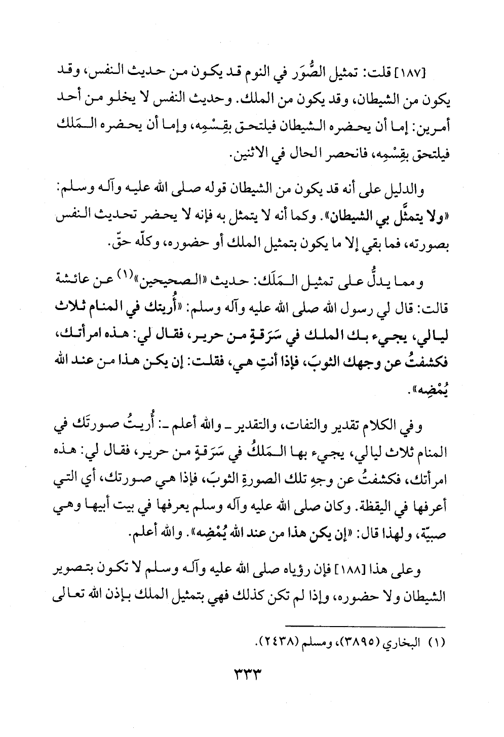 [١٨٧] قلت: تمثيل الصُّوَر في النوم قد يكون من حديث النفس، وقد يكون من الشيطان، وقد يكون من الملك. وحديث النفس لا يخلو من أحد أمرين: إما أن يحضره الشيطان فيلتحق بقِسْمِه، وإما أن يحضره المَلك فيلتحق بقِسْمِه، فانحصر الحال في الاثنين.