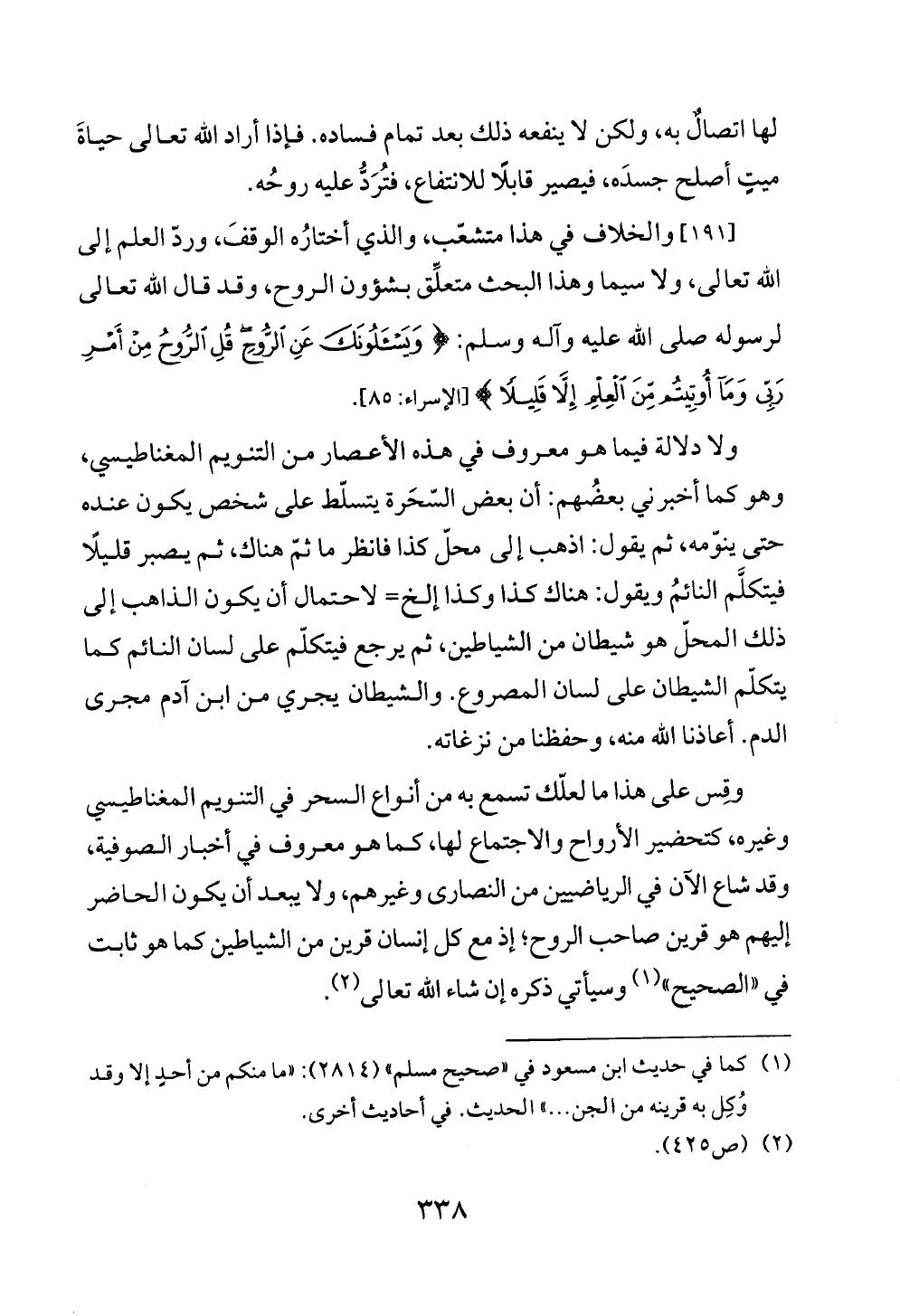 ولا دلالة فيما هو معروف في هذه الأعصار من التنويم المغناطيسي، وهو كما أخبرني بعضُهم: أن بعض السّحَرة يتسلّط على شخص يكون عنده حتى ينوّمه، ثم يقول: اذهب إلى محلّ كذا فانظر ما ثمّ هناك، ثم يصبر قليلًا فيتكلَّم النائمُ ويقول: هناك كذا وكذا إلخ= لاحتمال أن يكون الذاهب إلى ذلك المحلّ هو شيطان من الشياطين، ثم يرجع فيتكلّم على لسان النائم كما يتكلّم الشيطان على لسان المصروع. والشيطان يجري من ابن آدم مجرى الدم. أعاذنا الله منه، وحفظنا من نزغاته.