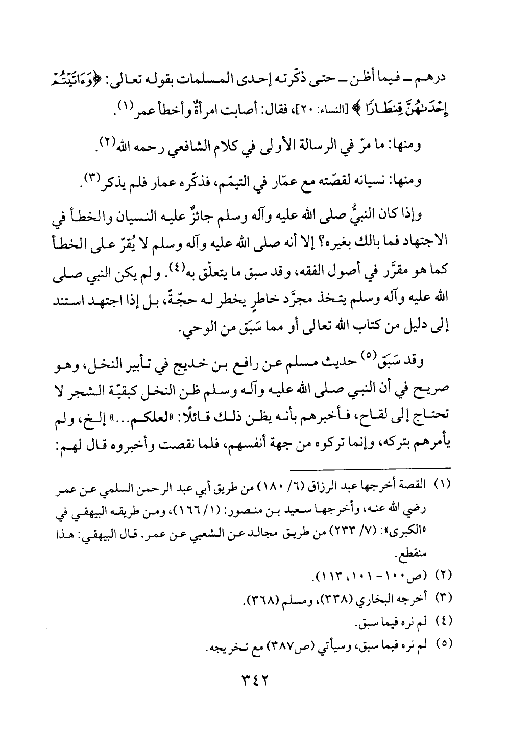 وإذا كان النبيُّ صلى الله عليه وآله وسلم جائزٌ عليه النسيان والخطأ في الاجتهاد فما بالك بغيره؟ إلا أنه صلى الله عليه وآله وسلم لا يُقرّ على الخطأ كما هو مقرَّر في أصول الفقه، وقد سبق ما يتعلّق به (¬٤). ولم يكن النبي صلى الله عليه وآله وسلم يتخذ مجرَّد خاطرٍ يخطر له حجّةً، بل إذا اجتهد استند إلى دليل من كتاب الله تعالى أو مما سَبَق من الوحي.