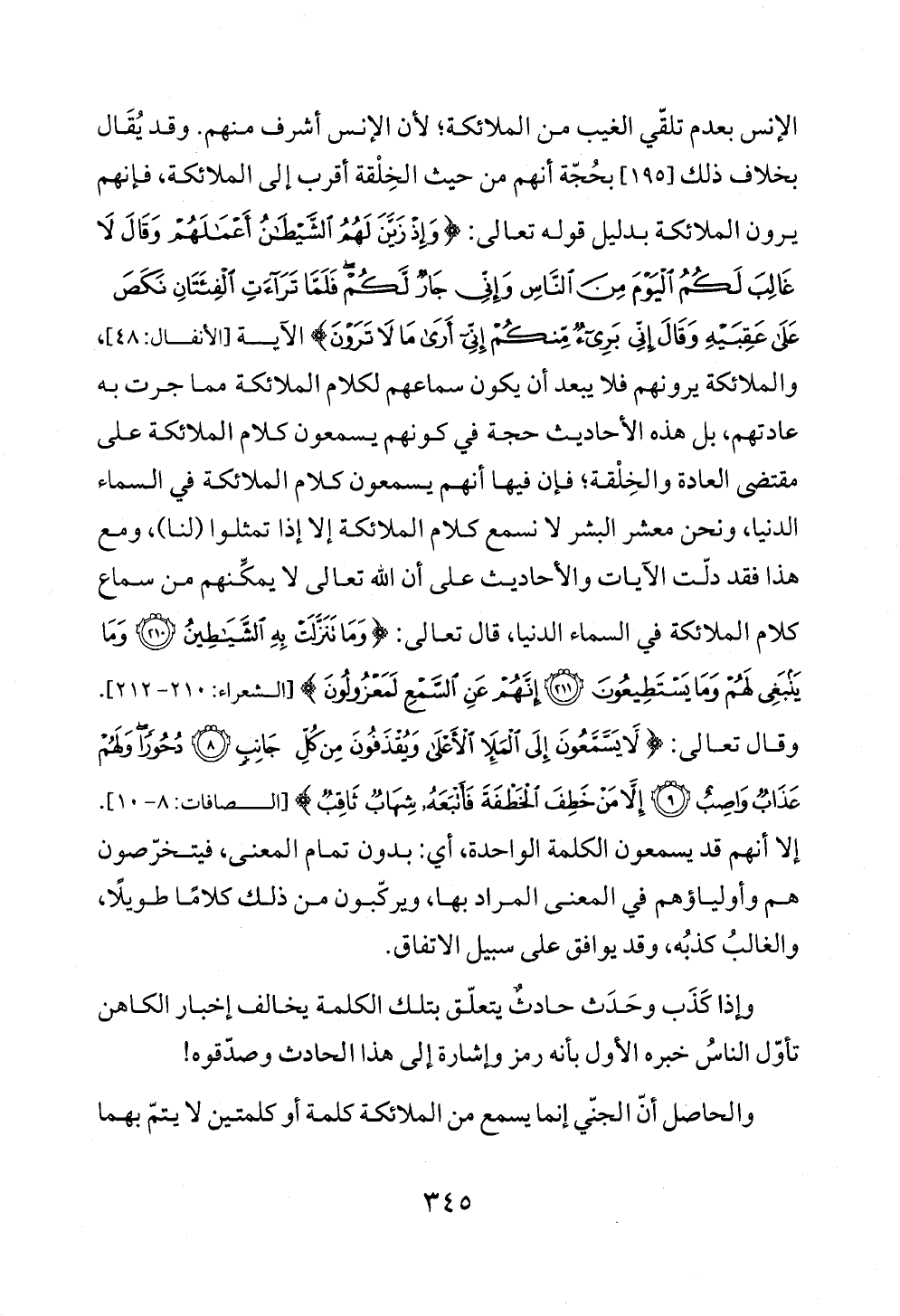 الإنس بعدم تلقّي الغيب من الملائكة؛ لأن الإنس أشرف منهم. وقد يُقَال بخلاف ذلك [١٩٥] بحُجّة أنهم من حيث الخِلْقة أقرب إلى الملائكة، فإنهم يرون الملائكة بدليل قوله تعالى: {وَإِذْ زَيَّنَ لَهُمُ الشَّيْطَانُ أَعْمَالَهُمْ وَقَالَ لَا غَالِبَ لَكُمُ الْيَوْمَ مِنَ النَّاسِ وَإِنِّي جَارٌ لَكُمْ فَلَمَّا تَرَاءَتِ الْفِئَتَانِ نَكَصَ عَلَى عَقِبَيْهِ وَقَالَ إِنِّي بَرِيءٌ مِنْكُمْ إِنِّي أَرَى مَا لَا تَرَوْنَ} الآية [الأنفال: ٤٨]، والملائكة يرونهم فلا يبعد أن يكون سماعهم لكلام الملائكة مما جرت به عادتهم، بل هذه الأحاديث حجة في كونهم يسمعون كلام الملائكة على مقتضى العادة والخِلْقة؛ فإن فيها أنهم يسمعون كلام الملائكة في السماء الدنيا، ونحن معشر البشر لا نسمع كلام الملائكة إلا إذا تمثلوا (لنا)، ومع هذا فقد دلّت الآيات والأحاديث على أن الله تعالى لا يمكِّنهم من سماع كلام الملائكة في السماء الدنيا، قال تعالى: {وَمَا تَنَزَّلَتْ بِهِ الشَّيَاطِينُ (٢١٠) وَمَا يَنْبَغِي لَهُمْ وَمَا يَسْتَطِيعُونَ (٢١١) إِنَّهُمْ عَنِ السَّمْعِ لَمَعْزُولُونَ} [الشعراء: ٢١٠ - ٢١٢]. وقال تعالى: {لَا يَسَّمَّعُونَ إِلَى الْمَلَإِ الْأَعْلَى وَيُقْذَفُونَ مِنْ كُلِّ جَانِبٍ (٨) دُحُورًا وَلَهُمْ عَذَابٌ وَاصِبٌ (٩) إِلَّا مَنْ خَطِفَ الْخَطْفَةَ فَأَتْبَعَهُ شِهَابٌ ثَاقِبٌ} [الصافات: ٨ - ١٠]. إلا أنهم قد يسمعون الكلمة الواحدة، أي: بدون تمام المعنى، فيتخرّصون هم وأولياؤهم في المعنى المراد بها، ويركّبون من ذلك كلامًا طويلًا، والغالبُ كذبُه، وقد يوافق على سبيل الاتفاق.