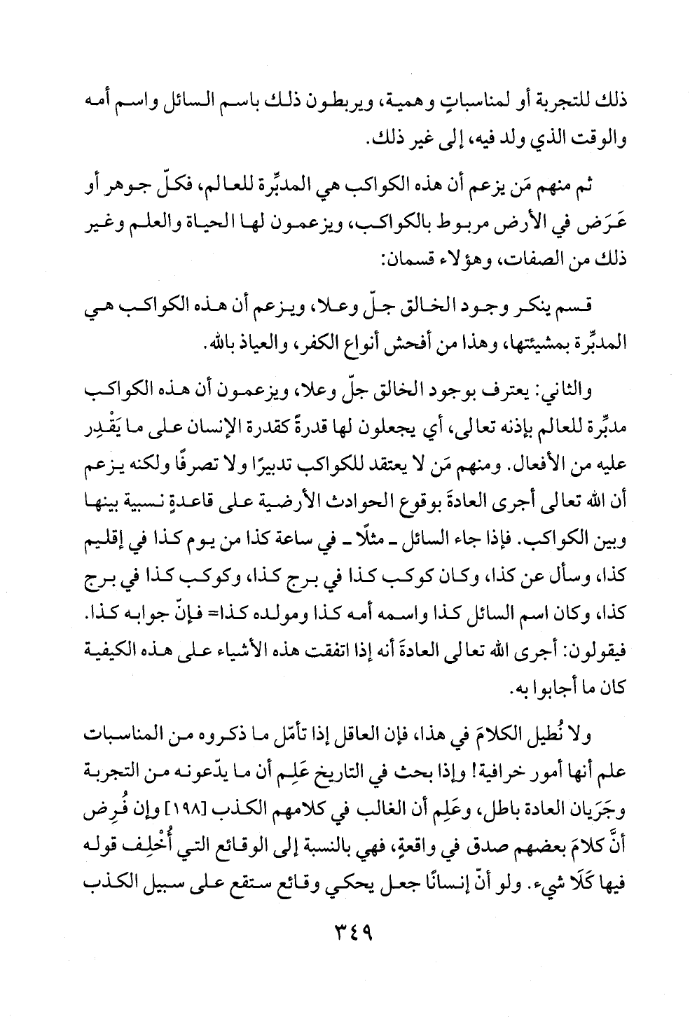 ولا نُطيل الكلامَ في هذا، فإن العاقل إذا تأمّل ما ذكروه من المناسبات علم أنها أمور خرافية! وإذا بحث في التاريخ عَلِم أن ما يدّعونه من التجربة وجَرَيان العادة باطل، وعَلِم أن الغالب في كلامهم الكذب [١٩٨] وإن فُرِض أنَّ كلامَ بعضهم صدق في واقعةٍ، فهي بالنسبة إلى الوقائع التي أُخْلِف قوله فيها كَلَا شيء. ولو أنّ إنسانًا جعل يحكي وقائع ستقع على سبيل الكذب