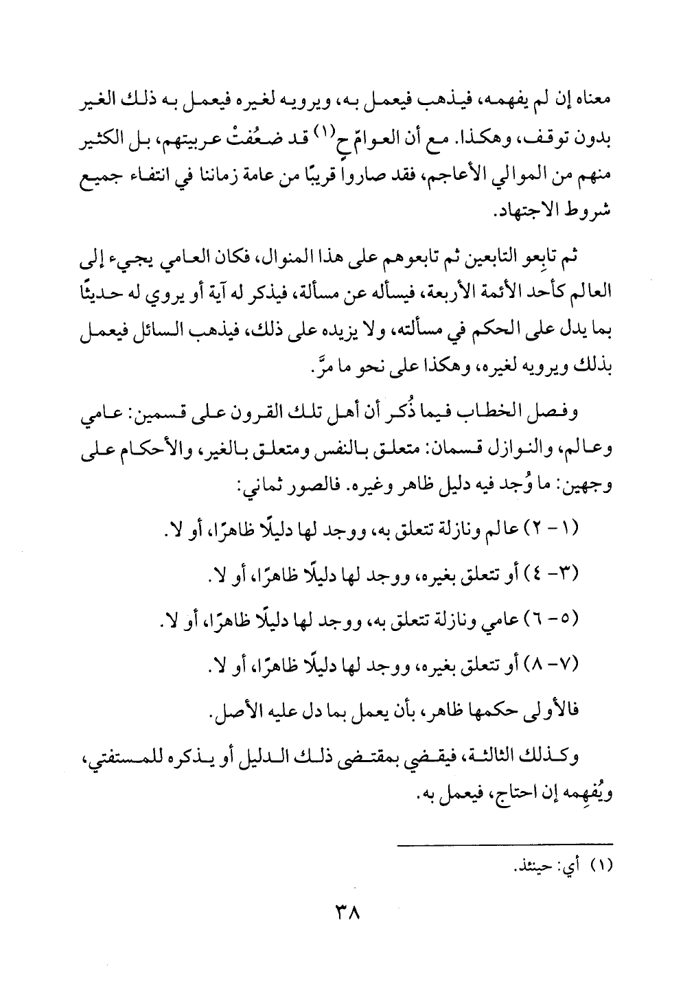 معناه إن لم يفهمه، فيذهب فيعمل به، ويرويه لغيره فيعمل به ذلك الغير بدون توقف، وهكذا. مع أن العوامّ حٍ (¬١) قد ضعُفتْ عربيتهم، بل الكثير منهم من الموالي الأعاجم، فقد صاروا قريبًا من عامة زماننا في انتفاء جميع شروط الاجتهاد.
