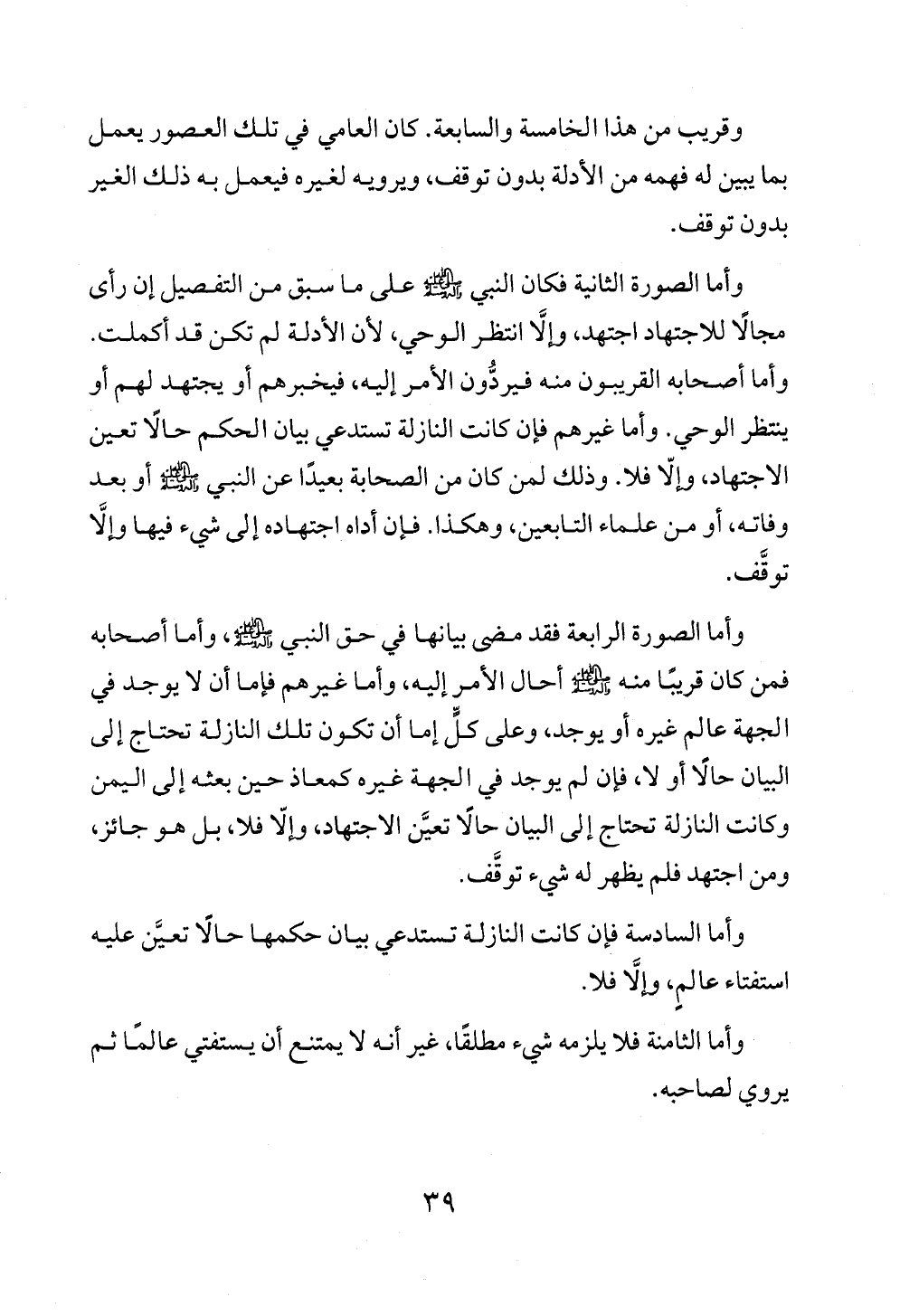 وأما الصورة الرابعة فقد مضى بيانها في حق النبي - صلى الله عليه وآله وسلم -، وأما أصحابه فمن كان قريبًا منه - صلى الله عليه وآله وسلم - أحال الأمر إليه، وأما غيرهم فإما أن لا يوجد في الجهة عالم غيره أو يوجد، وعلى كلٍّ إما أن تكون تلك النازلة تحتاج إلى البيان حالًا أو لا، فإن لم يوجد في الجهة غيره كمعاذ حين بعثه إلى اليمن وكانت النازلة تحتاج إلى البيان حالًا تعيَّن الاجتهاد، وإلّا فلا، بل هو جائز، ومن اجتهد فلم يظهر له شيء توقَّف.
