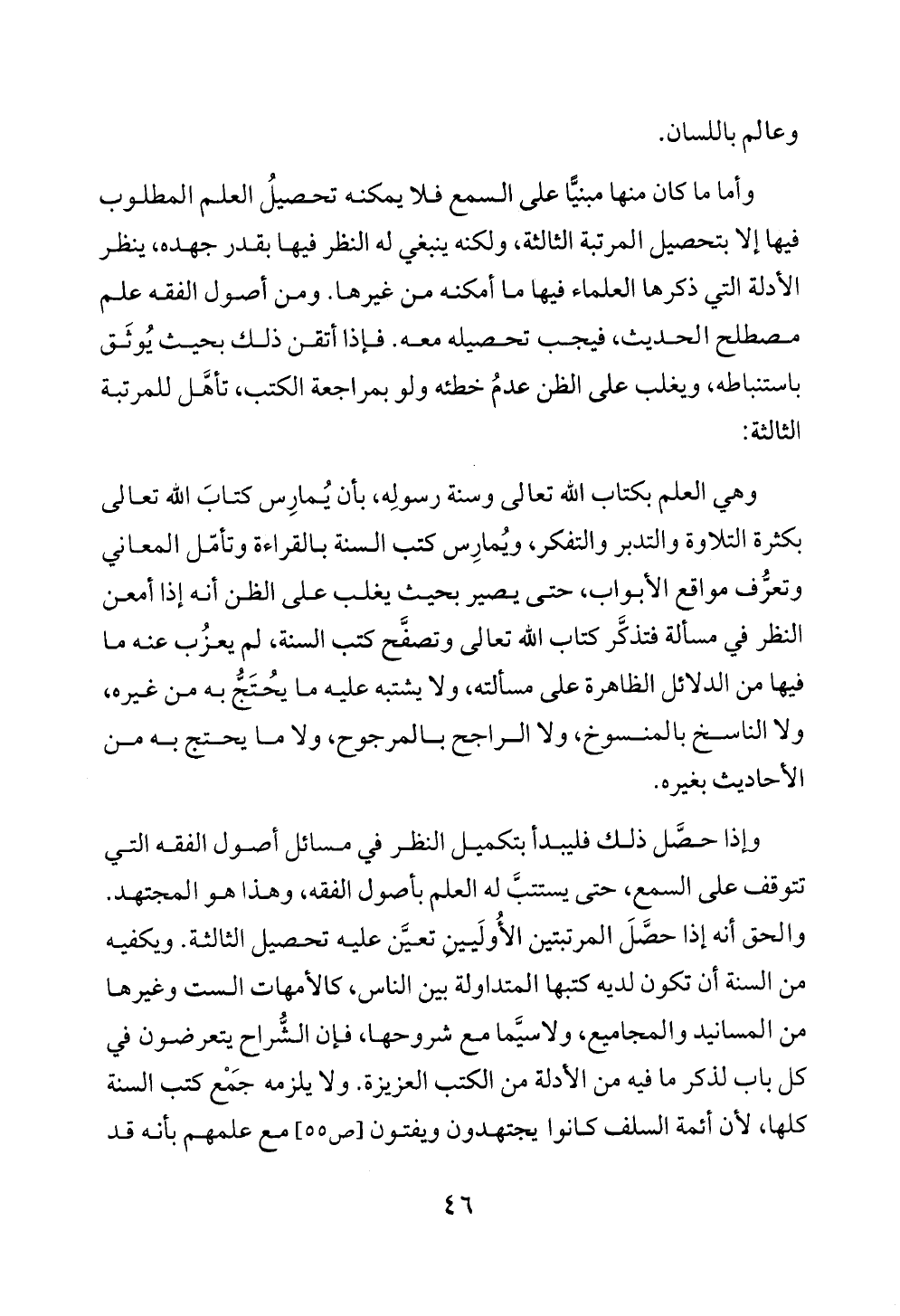 وإذا حصَّل ذلك فليبدأ بتكميل النظر في مسائل أصول الفقه التي تتوقف على السمع، حتى يستتبَّ له العلم بأصول الفقه، وهذا هو المجتهد. والحق أنه إذا حصَّلَ المرتبتين الأُولَيينِ تعيَّن عليه تحصيل الثالثة. ويكفيه من السنة أن تكون لديه كتبها المتداولة بين الناس، كالأمهات الست وغيرها من المسانيد والمجاميع، ولاسيَّما مع شروحها، فإن الشُّراح يتعرضون في كل باب لذكر ما فيه من الأدلة من الكتب العزيزة. ولا يلزمه جَمْع كتب السنة كلها، لأن أئمة السلف كانوا يجتهدون ويفتون [ص ٥٥] مع علمهم بأنه قد