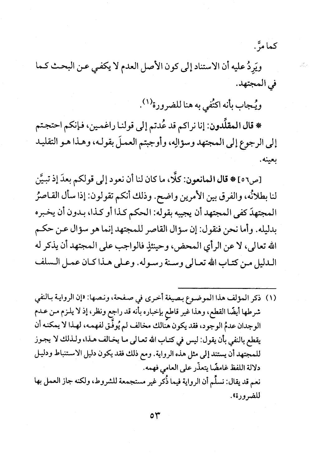 [ص ٥٦] * قال المانعون: كلَّا، ما كان لنا أن نعود إلى قولكم بعدَ إذ تبيَّن لنا بطلانُه، والفرق بين الأمرين واضح. وذلك أنكم تقولون: إذا سأل القاصرُ المجتهدَ كفى المجتهد أن يجيبه بقوله: الحكم كذا أو كذا، بدون أن يخبره بدليله. وأما نحن فنقول: إن سؤال القاصر للمجتهد إنما هو سؤال عن حكم الله تعالى، لا عن الرأي المحض، وحينئذٍ فالواجب على المجتهد أن يذكر له الدليل من كتاب الله تعالى وسنة رسوله. وعلى هذا كان عمل السلف