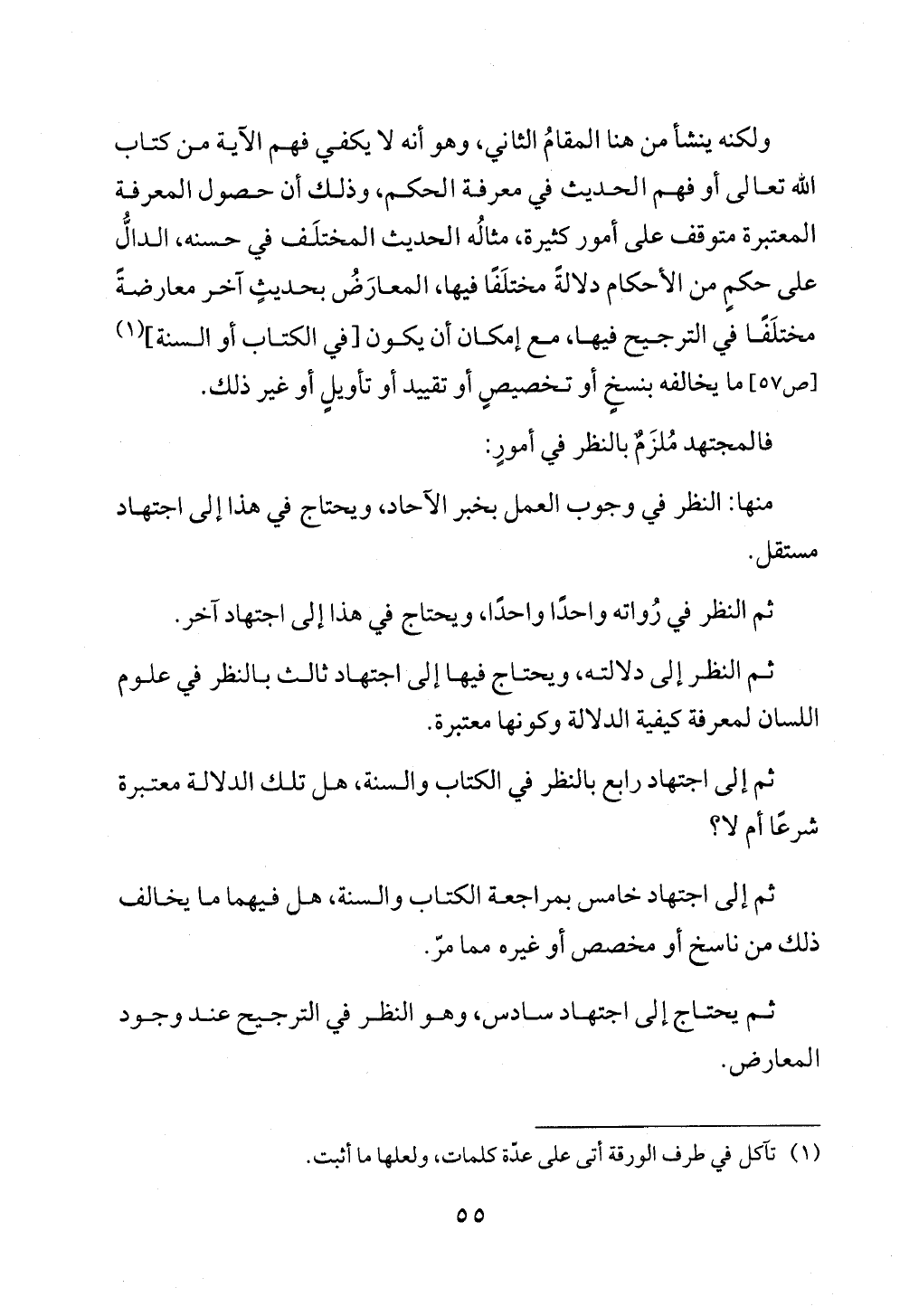 ولكنه ينشأ من هنا المقامُ الثاني، وهو أنه لا يكفي فهم الآية من كتاب الله تعالى أو فهم الحديث في معرفة الحكم، وذلك أن حصول المعرفة المعتبرة متوقف على أمور كثيرة، مثالُه الحديث المختلَف في حسنه، الدالُّ على حكمٍ من الأحكام دلالةً مختلَفًا فيها، المعارَضُ بحديثٍ آخر معارضةً مختلَفًا في الترجيح فيها، مع إمكان أن يكون [في الكتاب أو السنة] (¬١) [ص ٥٧] ما يخالفه بنسخٍ أو تخصيصٍ أو تقييد أو تأويلٍ أو غير ذلك.