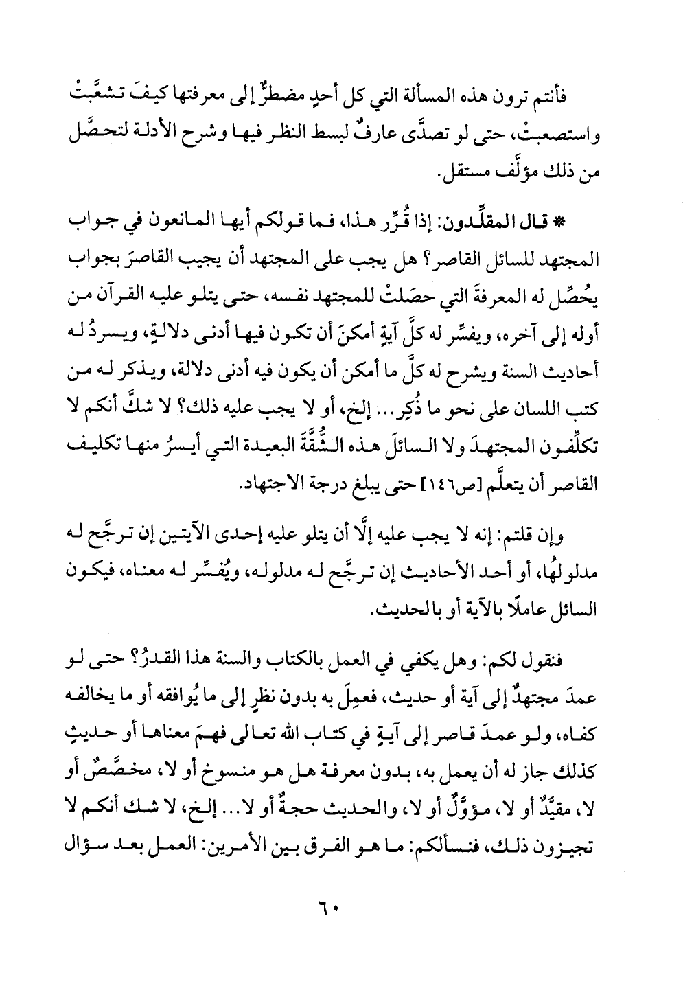 * قال المقلِّدون: إذا قُرِّر هذا، فما قولكم أيها المانعون في جواب المجتهد للسائل القاصر؟ هل يجب على المجتهد أن يجيب القاصرَ بجواب يُحصِّل له المعرفةَ التي حصَلتْ للمجتهد نفسه، حتى يتلو عليه القرآن من أوله إلى آخره، ويفسِّر له كلَّ آيةٍ أمكنَ أن تكون فيها أدنى دلالةٍ، ويسردُ له أحاديث السنة ويشرح له كلَّ ما أمكن أن يكون فيه أدنى دلالة، ويذكر له من كتب اللسان على نحو ما ذُكِر ... إلخ، أو لا يجب عليه ذلك؟ لا شكَّ أنكم لا تكلِّفون المجتهدَ ولا السائلَ هذه الشُّقَّةَ البعيدة التي أيسرُ منها تكليف القاصر أن يتعلَّم [ص ١٤٦] حتى يبلغ درجة الاجتهاد.