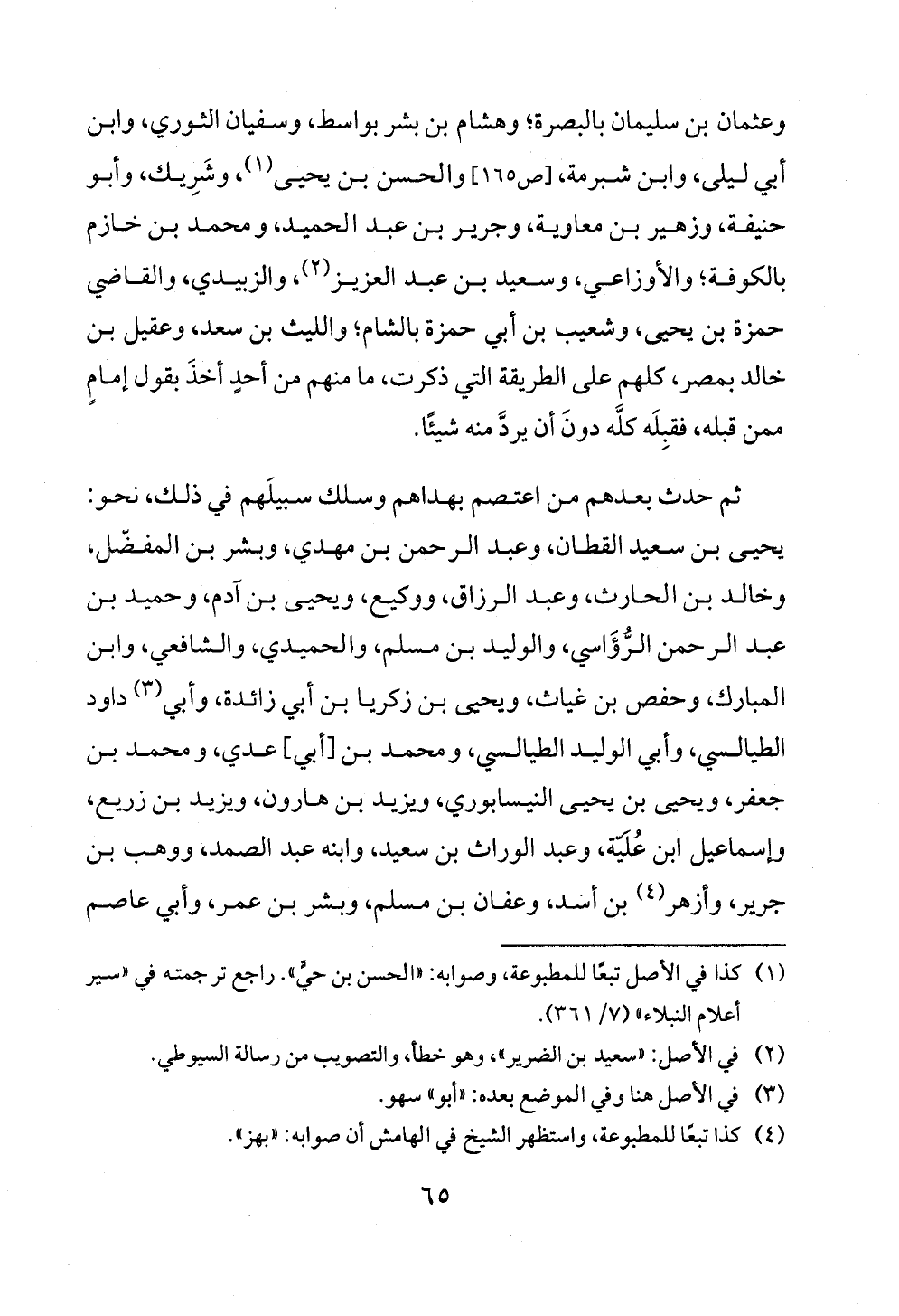 ثم حدث بعدهم من اعتصم بهداهم وسلك سبيلَهم في ذلك، نحو: يحيى بن سعيد القطان، وعبد الرحمن بن مهدي، وبشر بن المفضّل، وخالد بن الحارث، وعبد الرزاق، ووكيع، ويحيى بن آدم، وحميد بن عبد الرحمن الرُّؤَاسي، والوليد بن مسلم، والحميدي، والشافعي، وابن المبارك، وحفص بن غياث، ويحيى بن زكريا بن أبي زائدة، وأبي (¬٣) داود الطيالسي، وأبي الوليد الطيالسي، ومحمد بن [أبي] عدي، ومحمد بن جعفر، ويحيى بن يحيى النيسابوري، ويزيد بن هارون، ويزيد بن زريع، وإسماعيل ابن عُلَيّة، وعبد الوراث بن سعيد، وابنه عبد الصمد، ووهب بن جرير، وأزهر (¬٤) بن أسد، وعفان بن مسلم، وبشر بن عمر، وأبي عاصم