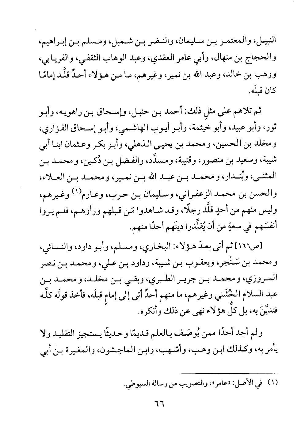 [ص ١٦٦] ثم أتى بعدَ هؤلاء: البخاري، ومسلم، وأبو داود، والنسائي، ومحمد بن سَنْجر، ويعقوب بن شيبة، وداود بن علي، ومحمد بن نصر المروزي، ومحمد بن جرير الطبري، وبقي بن مخلد، ومحمد بن عبد السلام الخُشَني وغيرهم، ما منهم أحدٌ أتى إلى إمامٍ قبلَه، فأخذ قولَه كلَّه فتديَّنَ به، بل كلُّ هؤلاء نهى عن ذلك وأنكره.