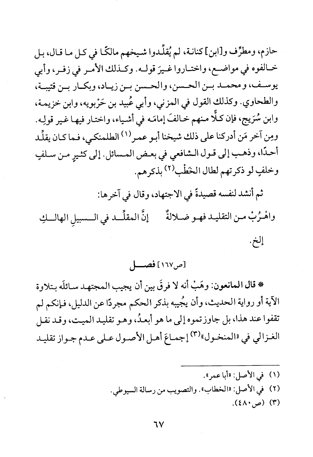 حازم، ومطرِّف و [ابن] كنانة، لم يُقلِّدوا شيخهم مالكًا في كل ما قال، بل خالفوه في مواضع، واختاروا غيرَ قوله. وكذلك الأمر في زفر، وأبي يوسف، ومحمد بن الحسن، والحسن بن زياد، وبكار بن قتيبة، والطحاوي. وكذلك القول في المزني، وأبي عُبيد بن حَرْبويه، وابن خزيمة، وابن سُرَيج، فإن كلًّا منهم خالفَ إمامَه في أشياء، واختار فيها غير قولِه. ومِن آخر مَن أدركنا على ذلك شيخنا أبو عمر (¬١) الطلمنكي، فما كان يقلِّد أحدًا، وذهب إلى قول الشافعي في بعض المسائل. إلى كثيرٍ من سلفٍ وخلفٍ لو ذكرتهم لطال الخَطْب (¬٢) بذكرهم.