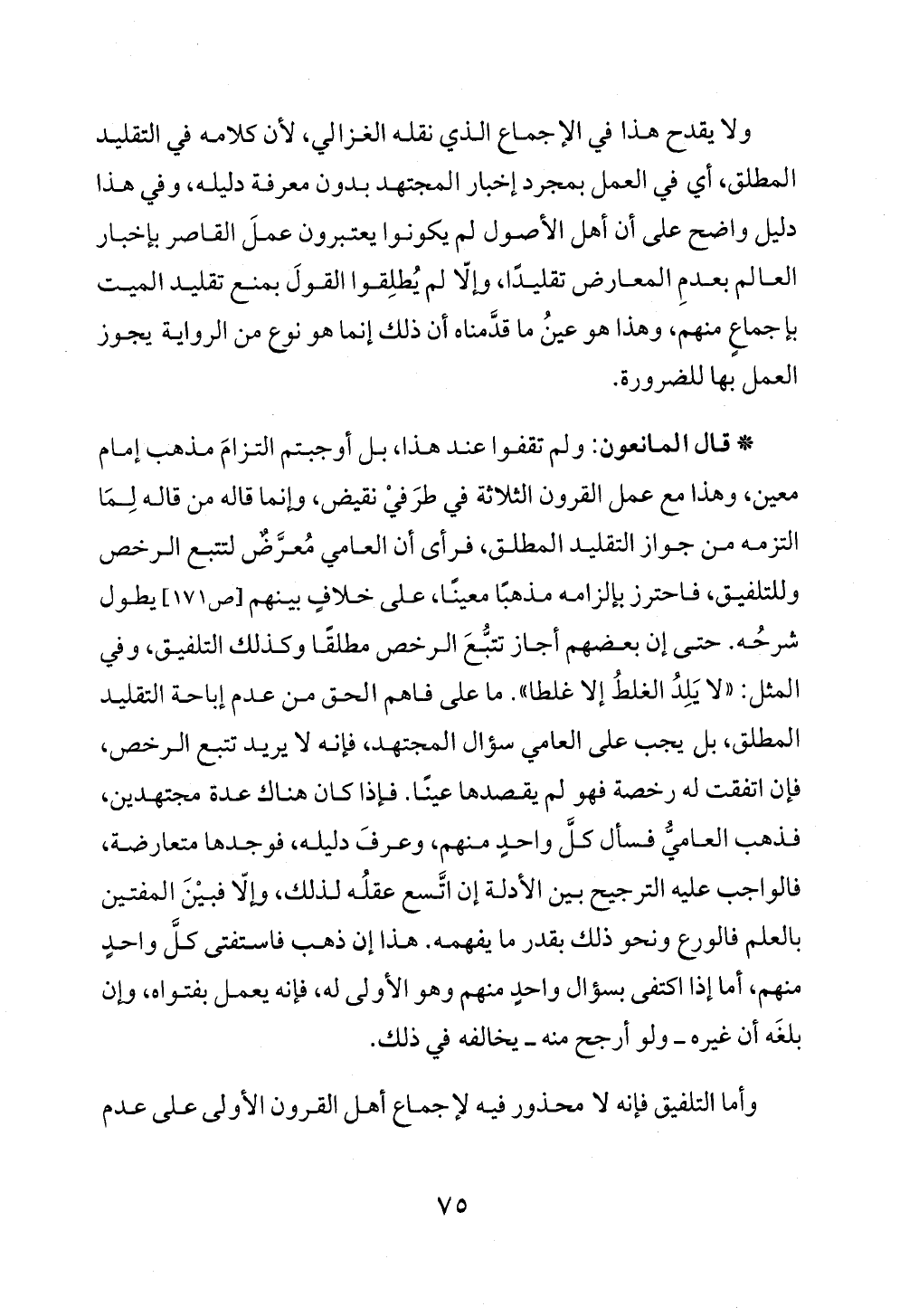 * قال المانعون: ولم تقفوا عند هذا، بل أوجبتم التزامَ مذهب إمام معين، وهذا مع عمل القرون الثلاثة في طرَفيْ نقيض، وإنما قاله من قاله لِمَا التزمه من جواز التقليد المطلق، فرأى أن العامي مُعرَّضٌ لتتبع الرخص وللتلفيق، فاحترز بإلزامه مذهبًا معينًا، على خلافٍ بينهم [ص ١٧١] يطول شرحُه. حتى إن بعضهم أجاز تتبُّعَ الرخص مطلقًا وكذلك التلفيق، وفي المثل: "لا يَلِدُ الغلطُ إلا غلطا". ما على فاهم الحق من عدم إباحة التقليد المطلق، بل يجب على العامي سؤال المجتهد، فإنه لا يريد تتبع الرخص، فإن اتفقت له رخصة فهو لم يقصدها عينًا. فإذا كان هناك عدة مجتهدين، فذهب العاميُّ فسأل كلَّ واحدٍ منهم، وعرفَ دليله، فوجدها متعارضة، فالواجب عليه الترجيح بين الأدلة إن اتَّسع عقلُه لذلك، وإلّا فبيْنَ المفتين بالعلم فالورع ونحو ذلك بقدر ما يفهمه. هذا إن ذهب فاستفتى كلَّ واحدٍ منهم، أما إذا اكتفى بسؤال واحدٍ منهم وهو الأولى له، فإنه يعمل بفتواه، وإن بلغَه أن غيره ــ ولو أرجح منه ــ يخالفه في ذلك.