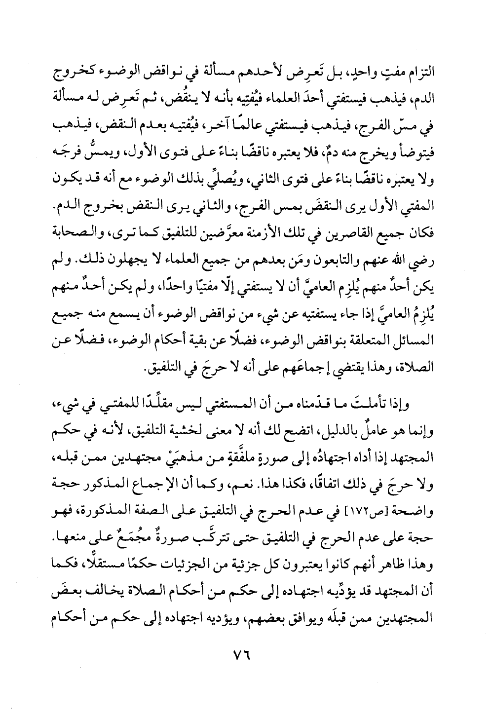 وإذا تأملتَ ما قدّمناه من أن المستفتي ليس مقلِّدًا للمفتي في شيء، وإنما هو عاملٌ بالدليل، اتضح لك أنه لا معنى لخشية التلفيق، لأنه في حكم المجتهد إذا أداه اجتهادُه إلى صورةٍ ملفَّقةٍ من مذهبَيْ مجتهدين ممن قبله، ولا حرجَ في ذلك اتفاقًا، فكذا هذا. نعم، وكما أن الإجماع المذكور حجة واضحة [ص ١٧٢] في عدم الحرج في التلفيق على الصفة المذكورة، فهو حجة على عدم الحرج في التلفيق حتى تتركَّب صورةٌ مُجمَعٌ على منعها. وهذا ظاهر أنهم كانوا يعتبرون كل جزئية من الجزئيات حكمًا مستقلًّا، فكما أن المجتهد قد يؤدِّيه اجتهاده إلى حكم من أحكام الصلاة يخالف بعضَ المجتهدين ممن قبلَه ويوافق بعضهم، ويؤديه اجتهاده إلى حكم من أحكام