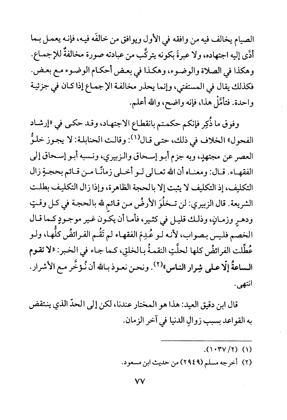وفوق ما ذُكِر فإنكم حكمتم بانقطاع الاجتهاد، وقد حكى في "إرشاد الفحول" الخلاف في ذلك، حتى قال (¬١): وقالت الحنابلة: لا يجوز خلوُّ العصر عن مجتهدٍ، وبه جزم أبو إسحاق والزبيري، ونسبه أبو إسحاق إلى الفقهاء. قال: ومعناه أن الله تعالى لو أخلى زمانًا من قائم بحجةٍ زال التكليف، إذ التكليف لا يثبت إلا بالحجة الظاهرة، وإذا زال التكليف بطلت الشريعة. قال الزبيري: لن تخلُوَ الأرضُ من قائمٍ لله بالحجة في كل وقتٍ ودهرٍ وزمانٍ، وذلك قليل في كثير، فأما أن يكون غير موجودٍ كما قال الخصم فليس بصواب، لأنه لو عُدِمَ الفقهاء لم تَقُم الفرائضُ كلُّها، ولو عُطِّلت الفرائضُ كلها لحلَّتِ النقمةُ بالخلقِ، كما جاء في الخبر: "لا تقوم الساعةُ إلّا على شِرار الناس" (¬٢). ونحن نعوذ بالله أن نُؤخَّر مع الأشرار. انتهى.