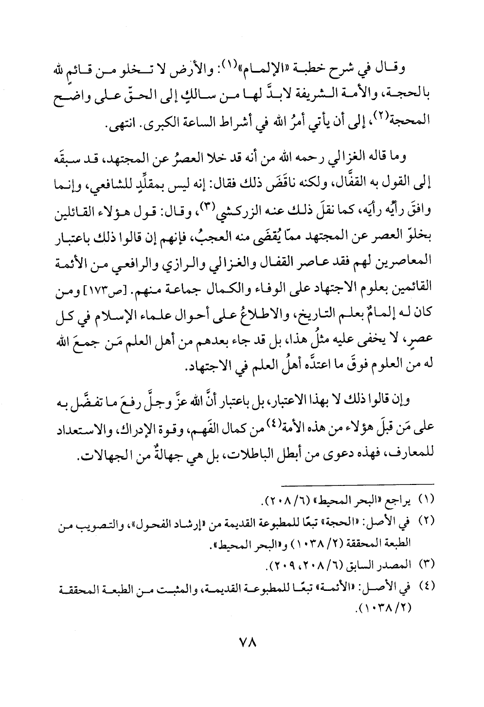 وما قاله الغزالي رحمه الله من أنه قد خلا العصرُ عن المجتهد، قد سبقَه إلى القول به القفَّال، ولكنه ناقَضَ ذلك فقال: إنه ليس بمقلِّدٍ للشافعي، وإنما وافقَ رأيُه رأيَه، كما نقلَ ذلك عنه الزركشي (¬٣)، وقال: قول هؤلاء القائلين بخلوّ العصر عن المجتهد ممّا يُقضَى منه العجبُ، فإنهم إن قالوا ذلك باعتبار المعاصرين لهم فقد عاصر القفال والغزالي والرازي والرافعي من الأئمة القائمين بعلوم الاجتهاد على الوفاء والكمال جماعة منهم. [ص ١٧٣] ومن كان له إلمامٌ بعلم التاريخ، والاطلاعُ على أحوال علماء الإسلام في كل عصرٍ، لا يخفى عليه مثلُ هذا، بل قد جاء بعدهم من أهل العلم مَن جمعَ الله له من العلوم فوقَ ما اعتدَّه أهلُ العلم في الاجتهاد.