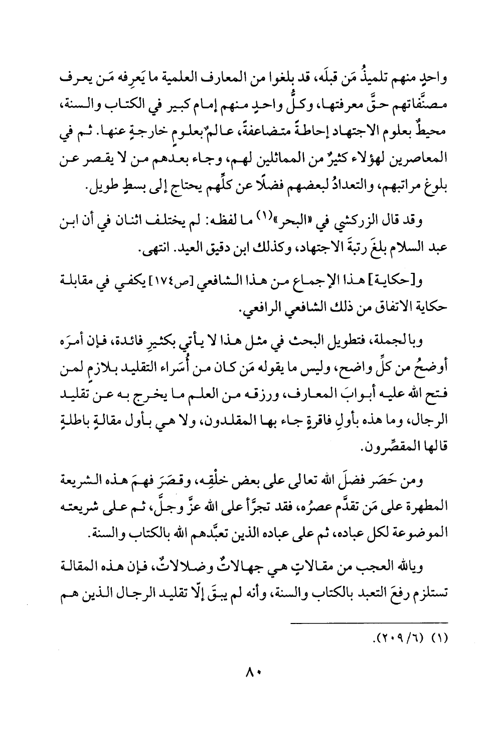 ويالله العجب من مقالاتٍ هي جهالاتٌ وضلالاتٌ، فإن هذه المقالة تستلزم رفعَ التعبد بالكتاب والسنة، وأنه لم يبقَ إلّا تقليد الرجال الذين هم