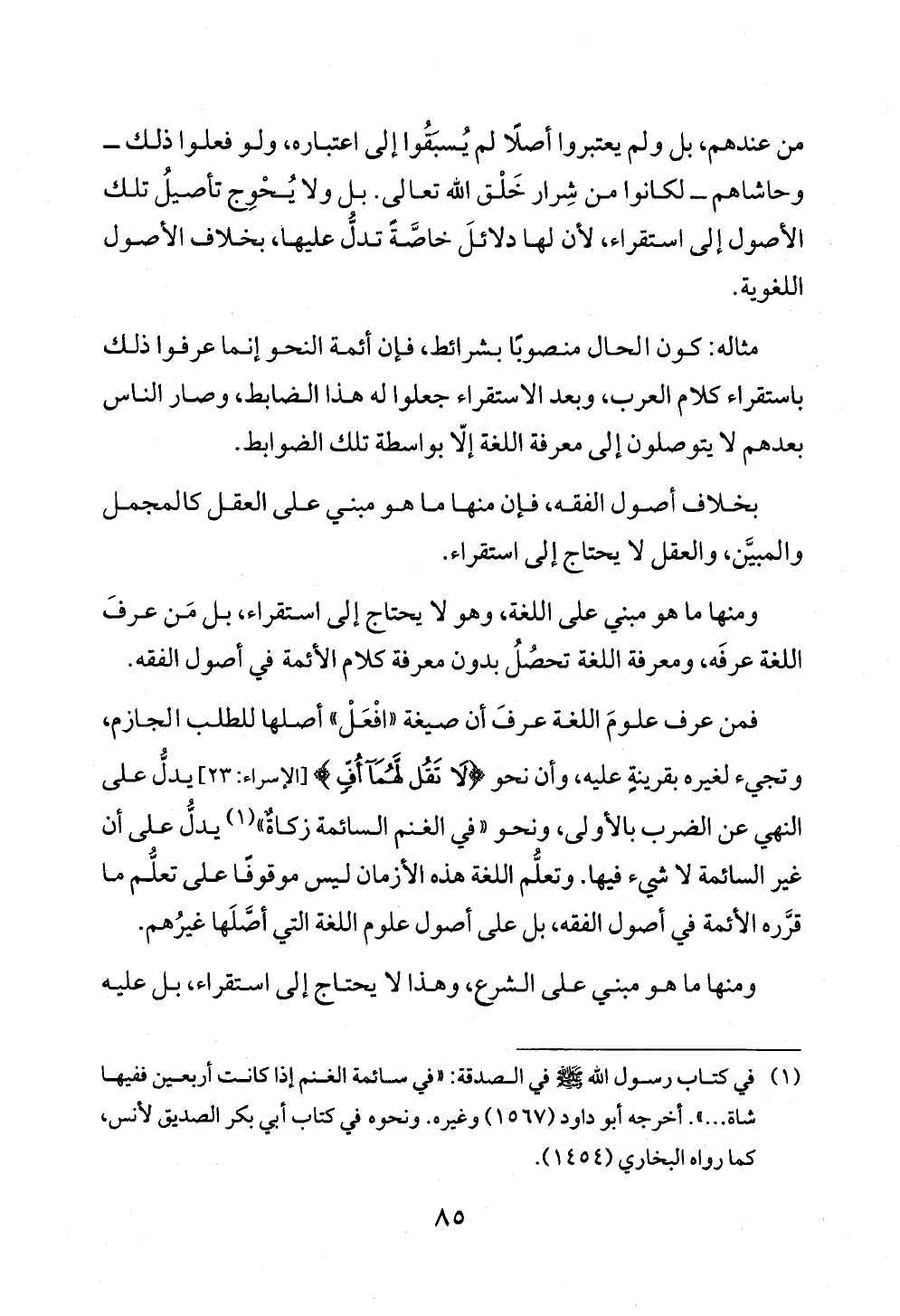 فمن عرف علومَ اللغة عرفَ أن صيغة "افْعَلْ" أصلها للطلب الجازم، وتجيء لغيره بقرينةٍ عليه، وأن نحو {لَا تَقُلْ لَهُمَا أُفٍّ} [الإسراء: ٢٣] يدلُّ على النهي عن الضرب بالأولى، ونحو "في الغنم السائمة زكاةٌ" (¬١) يدلُّ على أن غير السائمة لا شيء فيها. وتعلُّم اللغة هذه الأزمان ليس موقوفًا على تعلُّم ما قرَّره الأئمة في أصول الفقه، بل على أصول علوم اللغة التي أصَّلَها غيرُهم.