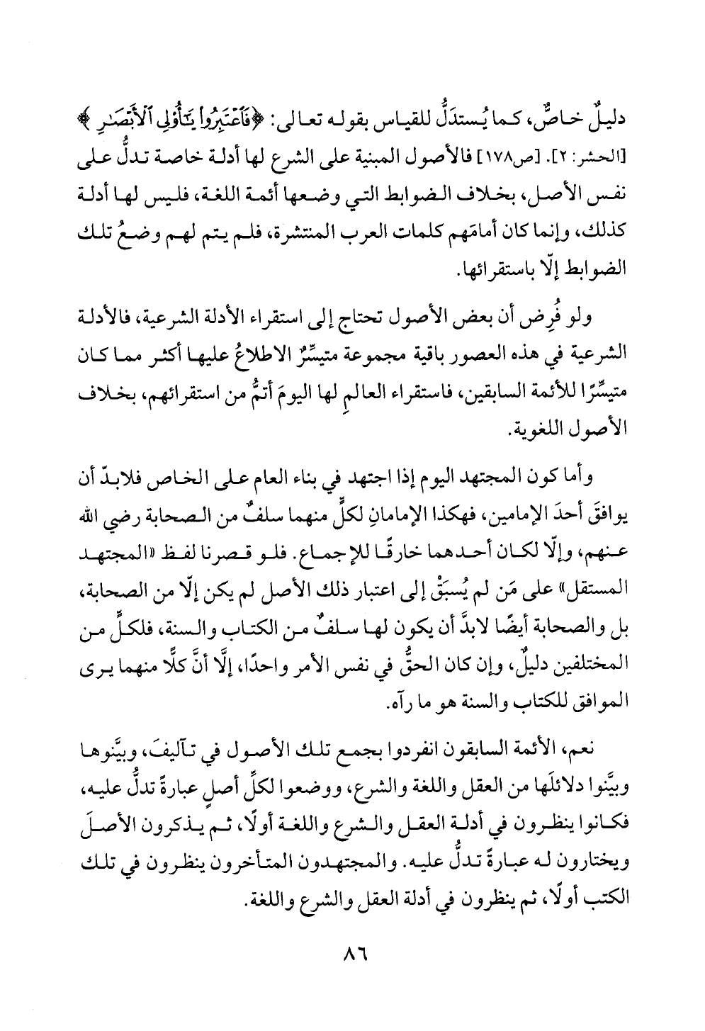 دليلٌ خاصٌّ، كما يُستدَلُّ للقياس بقوله تعالى: {فَاعْتَبِرُوا يَاأُولِي الْأَبْصَارِ} [الحشر: ٢]. [ص ١٧٨] فالأصول المبنية على الشرع لها أدلة خاصة تدلُّ على نفس الأصل، بخلاف الضوابط التي وضعها أئمة اللغة، فليس لها أدلة كذلك، وإنما كان أمامَهم كلمات العرب المنتشرة، فلم يتم لهم وضعُ تلك الضوابط إلّا باستقرائها.
