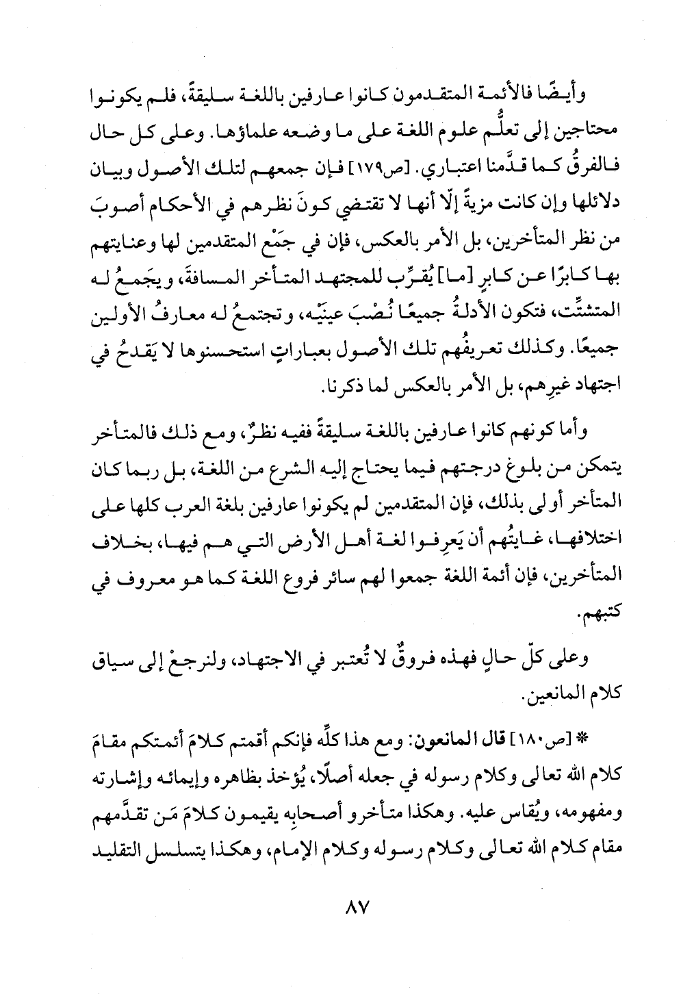 وأيضًا فالأئمة المتقدمون كانوا عارفين باللغة سليقةً، فلم يكونوا محتاجين إلى تعلُّم علوم اللغة على ما وضعه علماؤها. وعلى كل حال فالفرقُ كما قدَّمنا اعتباري. [ص ١٧٩] فإن جمعهم لتلك الأصول وبيان دلائلها وإن كانت مزيةً إلّا أنها لا تقتضي كونَ نظرهم في الأحكام أصوبَ من نظر المتأخرين، بل الأمر بالعكس، فإن في جَمْع المتقدمين لها وعنايتهم بها كابرًا عن كابرٍ [ما] يُقرِّب للمجتهد المتأخر المسافةَ، ويَجمعُ له المتشتِّت، فتكون الأدلةُ جميعًا نُصْبَ عينَيْه، وتجتمعُ له معارفُ الأولين جميعًا. وكذلك تعريفُهم تلك الأصول بعباراتٍ استحسنوها لا يَقدحُ في اجتهاد غيرِهم، بل الأمر بالعكس لما ذكرنا.