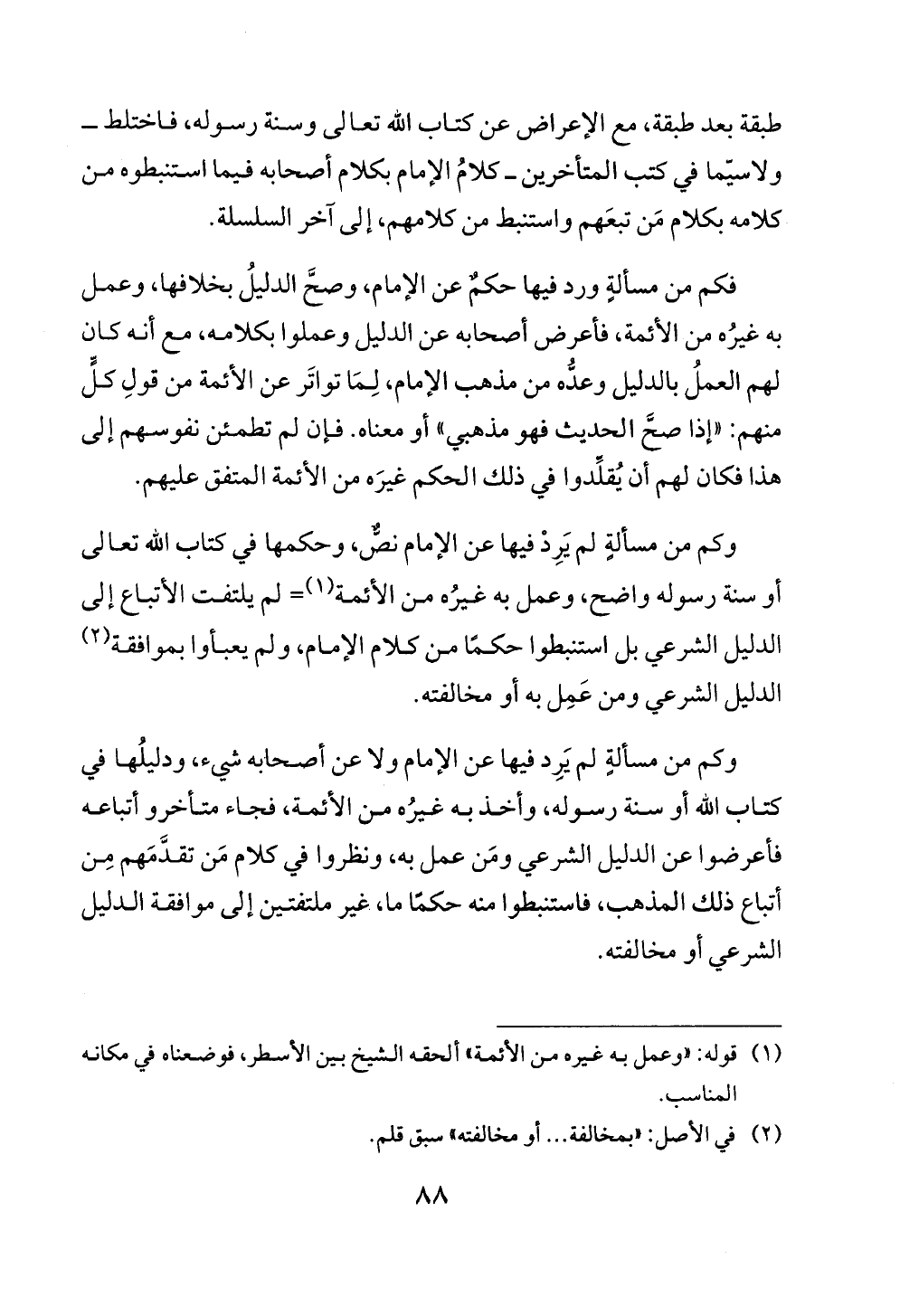 وكم من مسألةٍ لم يَرِدْ فيها عن الإمام نصٌّ، وحكمها في كتاب الله تعالى أو سنة رسوله واضح، وعمل به غيرُه من الأئمة (¬١) = لم يلتفت الأتباع إلى الدليل الشرعي بل استنبطوا حكمًا من كلام الإمام، ولم يعبأوا بموافقة (¬٢) الدليل الشرعي ومن عَمِل به أو مخالفته.
