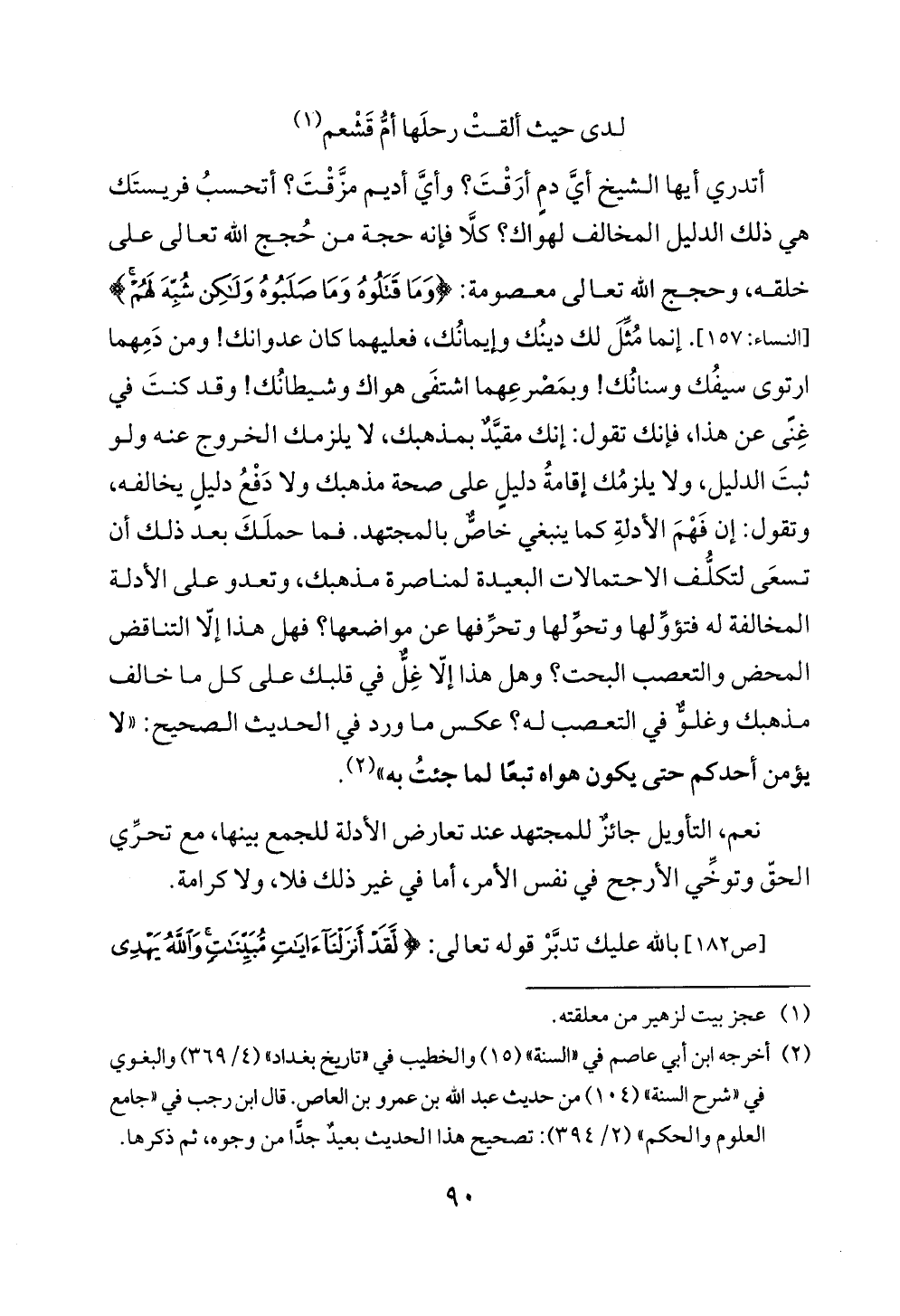 أتدري أيها الشيخ أيَّ دمٍ أرَقْتَ؟ وأيَّ أديم مزَّقْتَ؟ أتحسبُ فريستَك هي ذلك الدليل المخالف لهواك؟ كلَّا فإنه حجة من حُجج الله تعالى على خلقه، وحجج الله تعالى معصومة: {وَمَا قَتَلُوهُ وَمَا صَلَبُوهُ وَلَكِنْ شُبِّهَ لَهُمْ} [النساء: ١٥٧]. إنما مُثِّلَ لك دينُك وإيمانُك، فعليهما كان عدوانك! ومن دَمِهما ارتوى سيفُك وسنانُك! وبمَصْرعِهما اشتفَى هواك وشيطانُك! وقد كنتَ في غِنًى عن هذا، فإنك تقول: إنك مقيَّدٌ بمذهبك، لا يلزمك الخروج عنه ولو ثبتَ الدليل، ولا يلزمُك إقامةُ دليلٍ على صحة مذهبك ولا دَفْعُ دليلٍ يخالفه، وتقول: إن فَهْمَ الأدلةِ كما ينبغي خاصٌّ بالمجتهد. فما حملَكَ بعد ذلك أن تسعَى لتكلُّف الاحتمالات البعيدة لمناصرة مذهبك، وتعدو على الأدلة المخالفة له فتؤوِّلها وتحوِّلها وتحرِّفها عن مواضعها؟ فهل هذا إلّا التناقض المحض والتعصب البحت؟ وهل هذا إلّا غِلٌّ في قلبك على كل ما خالف مذهبك وغلوٌّ في التعصب له؟ عكس ما ورد في الحديث الصحيح: "لا يؤمن أحدكم حتى يكون هواه تبعًا لما جئتُ به" (¬٢).