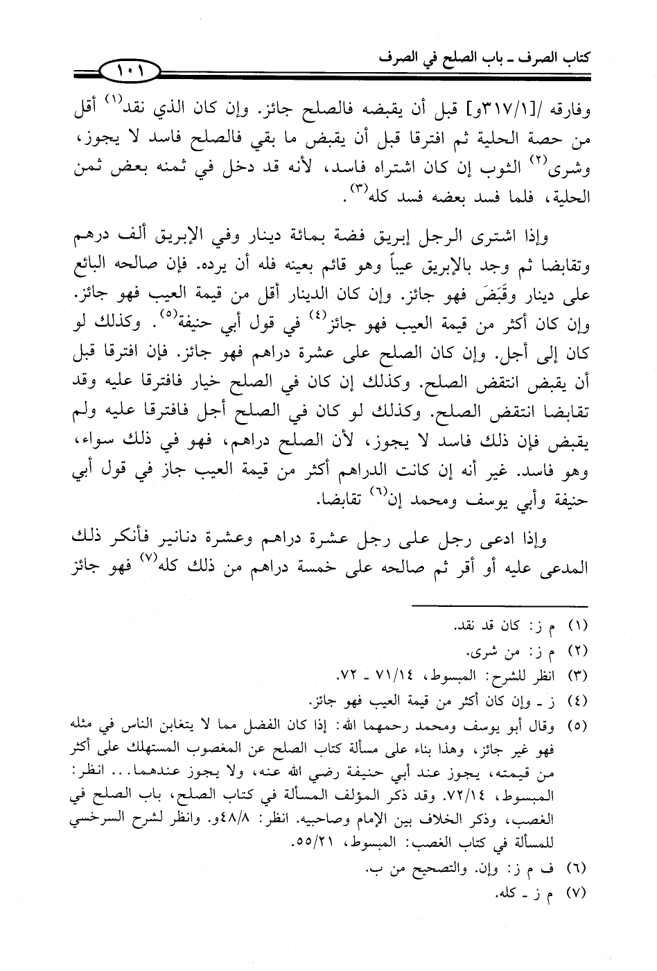 وإذا اشترى الرجل إبريق فضة بمائة دينار وفي الإبريق ألف درهم وتقابضا ثم وجد بالإبريق عيباً وهو قائم بعينه فله أن يرده. فإن صالحه البائع على دينار وقَبَضَ فهو جائز. وإن كان الدينار أقل من قيمة العيب فهو جائز. وإن كان أكثر من قيمة العيب فهو جائز (¬4) في قول أبي حنيفة (¬5). وكذلك لو كان إلى أجل. وإن كان الصلح على عشرة دراهم فهو جائز. فإن افترقا قبل أن يقبض انتقض الصلح. وكذلك إن كان في الصلح خيار فافترقا عليه وقد تقابضا انتقض الصلح. وكذلك لو كان في الصلح أجل فافترقا عليه ولم يقبض فإن ذلك فاسد لا يجوز، لأن الصلح دراهم، فهو في ذلك سواء، وهو فاسد. غير أنه إن كانت الدراهم أكثر من قيمة العيب جاز في قول أبي حنيفة وأبي يوسف ومحمد إن (¬6) تقابضا.