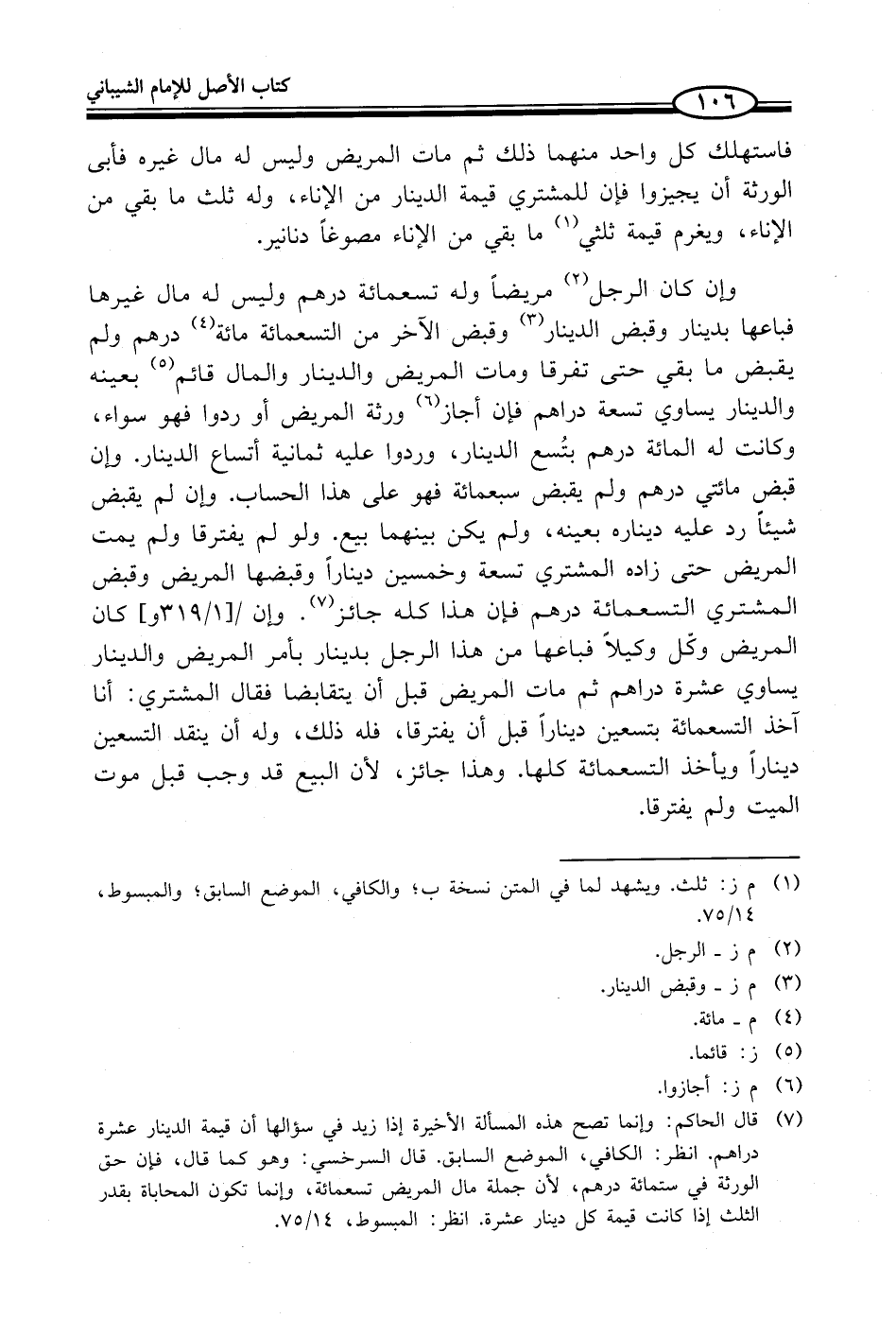 (¬7) قال الحاكم: وإنما تصح هذه المسألة الأخيرة إذا زيد في سؤالها أن قيمة الدينار عشرة دراهم. انظر: الكافي، الموضع السابق. قال السرخسي: وهو كما قال، فإن حق الورثة في ستمائة درهم، لأن جملة مال المريض تسعمائة، وإنما تكون المحاباة بقدر الثلث إذا كانت قيمة كل دينار عشرة انظر: المبسوط، 14/ 75.